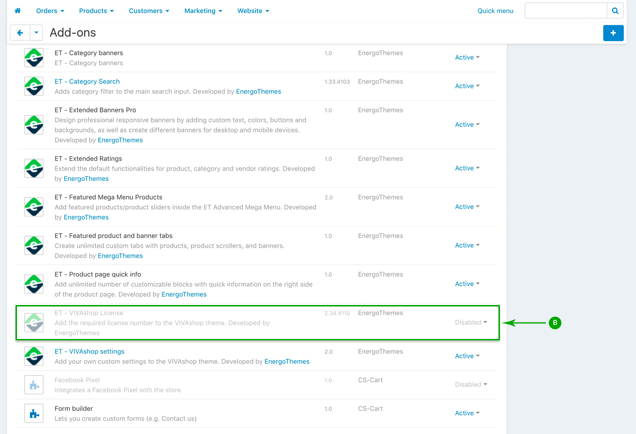 Please note that the theme will display on your site only if the “ET - VIVAshop license” addon is configured and activated. In order to activate your theme license please follow all of the steps indicated below, in the exact order they are presented:
