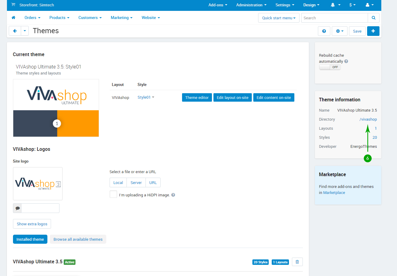 On the right side of the page, under the "Theme information" section, find the "Directory" text and click on the "/vivashop" link.