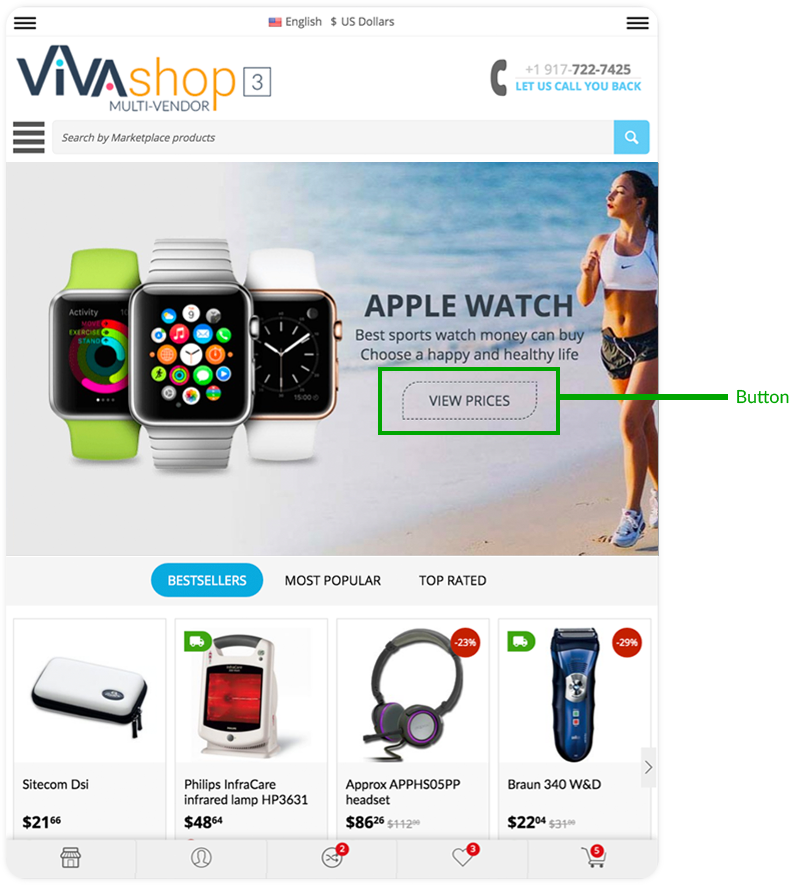 - Center - Place the button in the center, inside the Info Block (this is the option that we have selected for the demo “VIVAshop - Homepage - Main slider - Banner 1” banner)