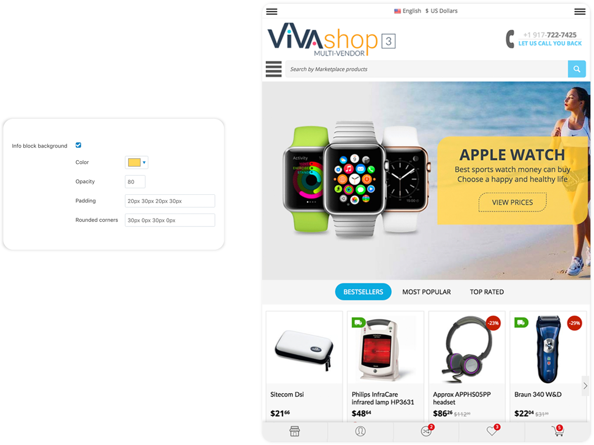 The “Extended Banners Pro” add-on have plenty of options so you can build beautiful responive banners: add your custom images, add and customize your own HTML text, buttons, fonts, colors, links, image and text animations, image and text positions, backgrounds, etc... Any banner you create can be an Extended Banner. For VIVAshop Multi-Vendor version, vendors can also create Extended Banners for their own store homepages, thus being able to create beautiful stores in your Marketplace, increasing its quality.