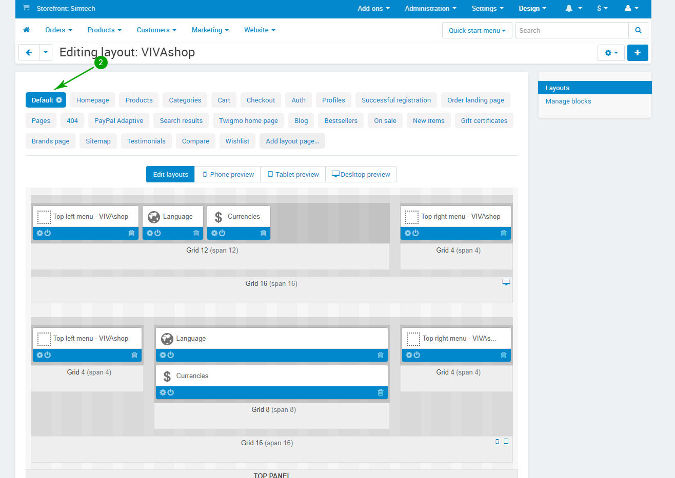 Log into your Administrator area of your CS-Cart installation and navigate to "Design" - "Layouts"