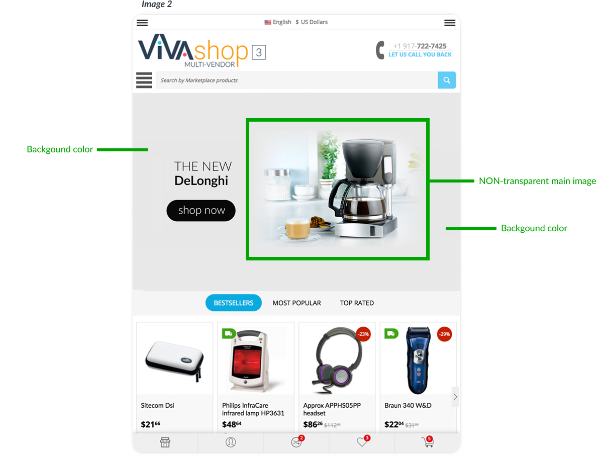 For the “VIVAshop - Homepage - Main slider - Banner 1” banner we have chosen the “Bottom” option, so the Additional Image will come from the bottom.