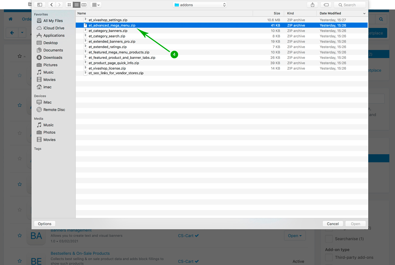 Select the add-on that you want to install and click on “Open”. In this example we have selected the first add-on called “et_advanced_mega_menu.zip”.
