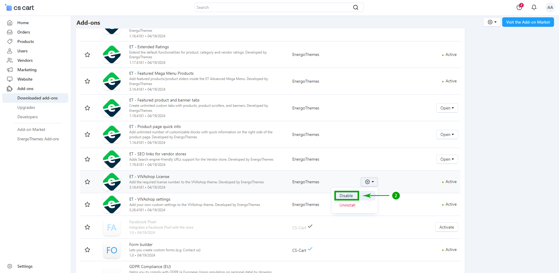 Scroll down the page until you see the "VIVAshop license" add-on, hover over the right side of the add-on, click the gear icon then select "Disable".