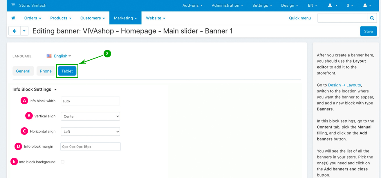 For the “VIVAshop - Homepage - Main slider - Banner 1” banner we have used the following options for sections C, D and E: