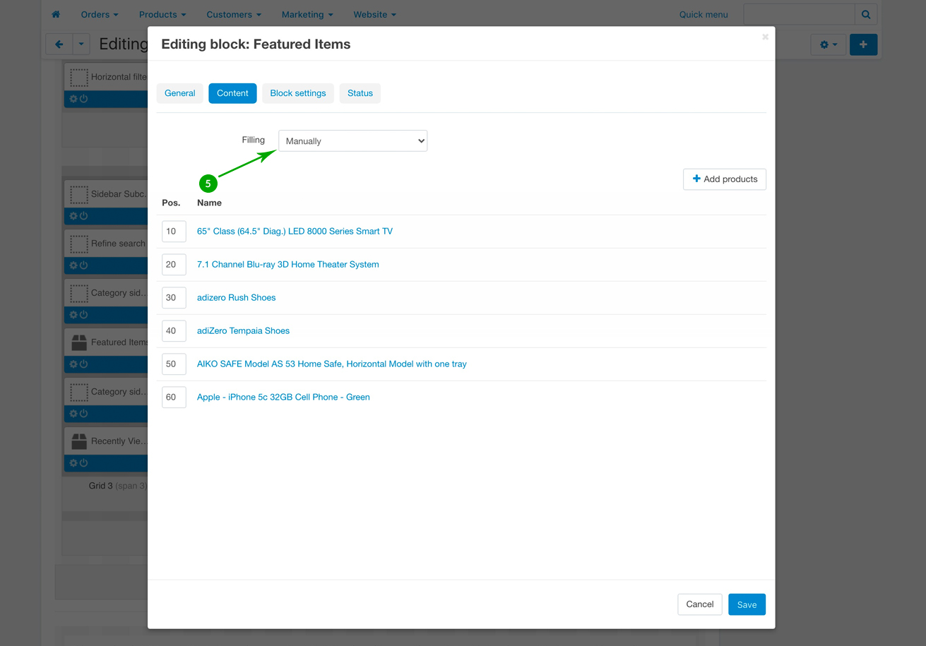 Next, click on the “Content” tab, and select your desired option from the “Filling” dropdown, then choose its settings accordingly. In this example we have chosen the “Manually” option in order to manually add the products that we want.