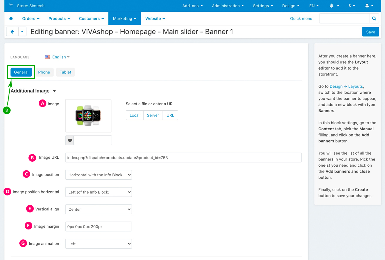 For the “VIVAshop - Homepage - Main slider - Banner 1” banner we have used the following options for sections C, D and E: