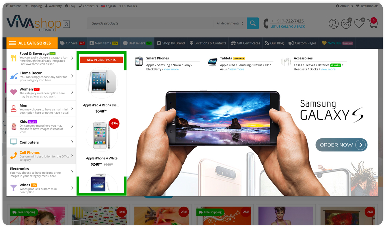 The “Featured Mega Menu Products” add-on allows you to add horizontal or vertical featured product scrollers inside the expanded Mega Menu window. These featured products may only be added to your first level categories. For Multi-Vendor users, this would be a great monetizing tool as your can add any products from any Vendor in your Marketplace, thus charging them for this service. NOTE: Featured products only display on DESKTOP version.