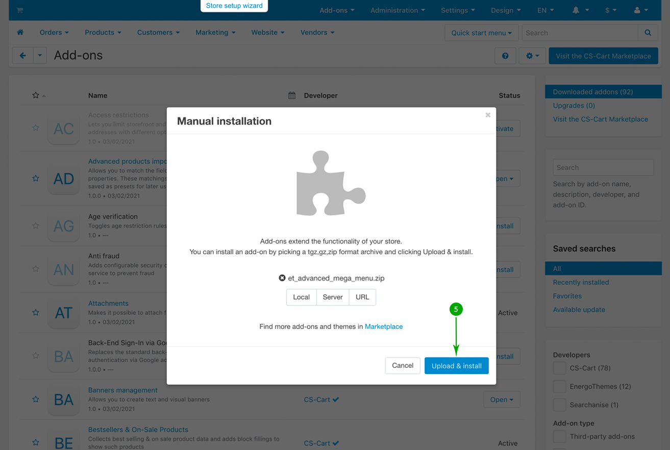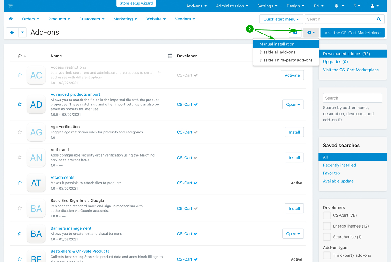 Log into your Administrator area of your CS-Cart installation and navigate to "Add-ons" - "Downloaded add-ons"