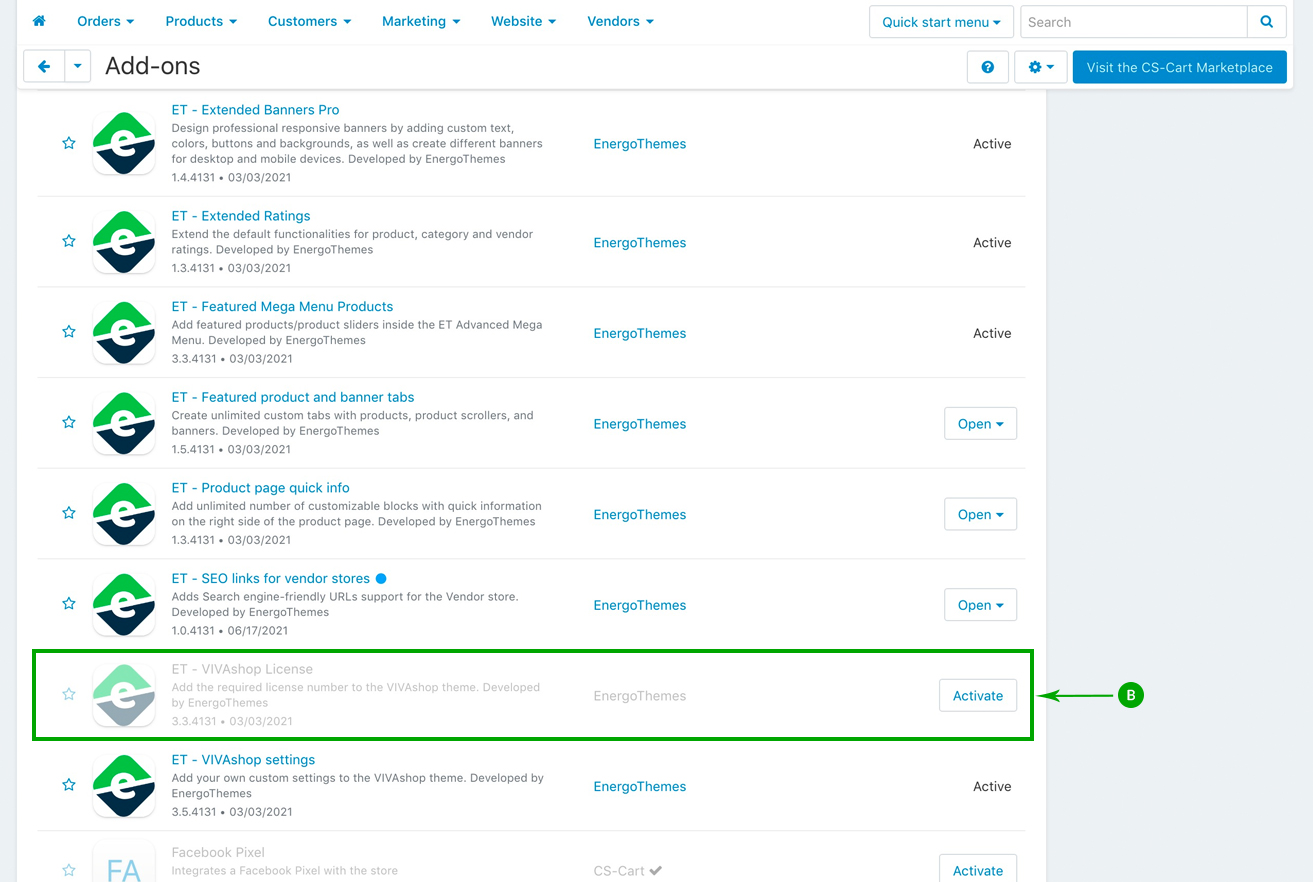B: Scroll down the page until you see the "ET - VIVAshop license" add-on, and click on its name