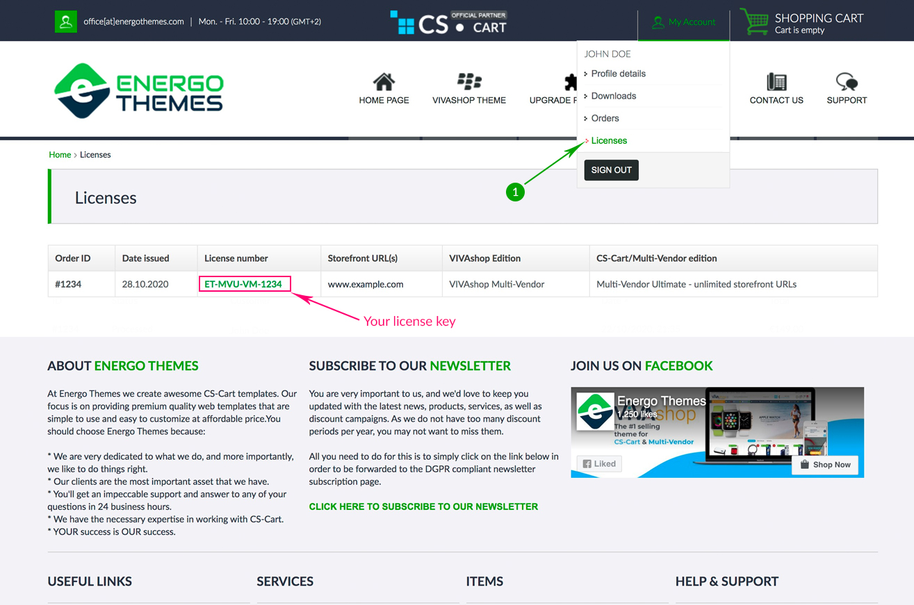 Find your license key. So, simply login to your account and go to “My account” - “Licenses” section. Here, you will find a list of all of your licenses together with the Order ID in which license was purchased, date issued, license number, URL(s) licensed under the respective license number, VIVAshop Edition the license was issued for, as well as the CS-Cart/Multi-Vendor edition that the VIVAshop license works on. Therefore, just copy the license number which is displayed in green color in the table, as in the image below.