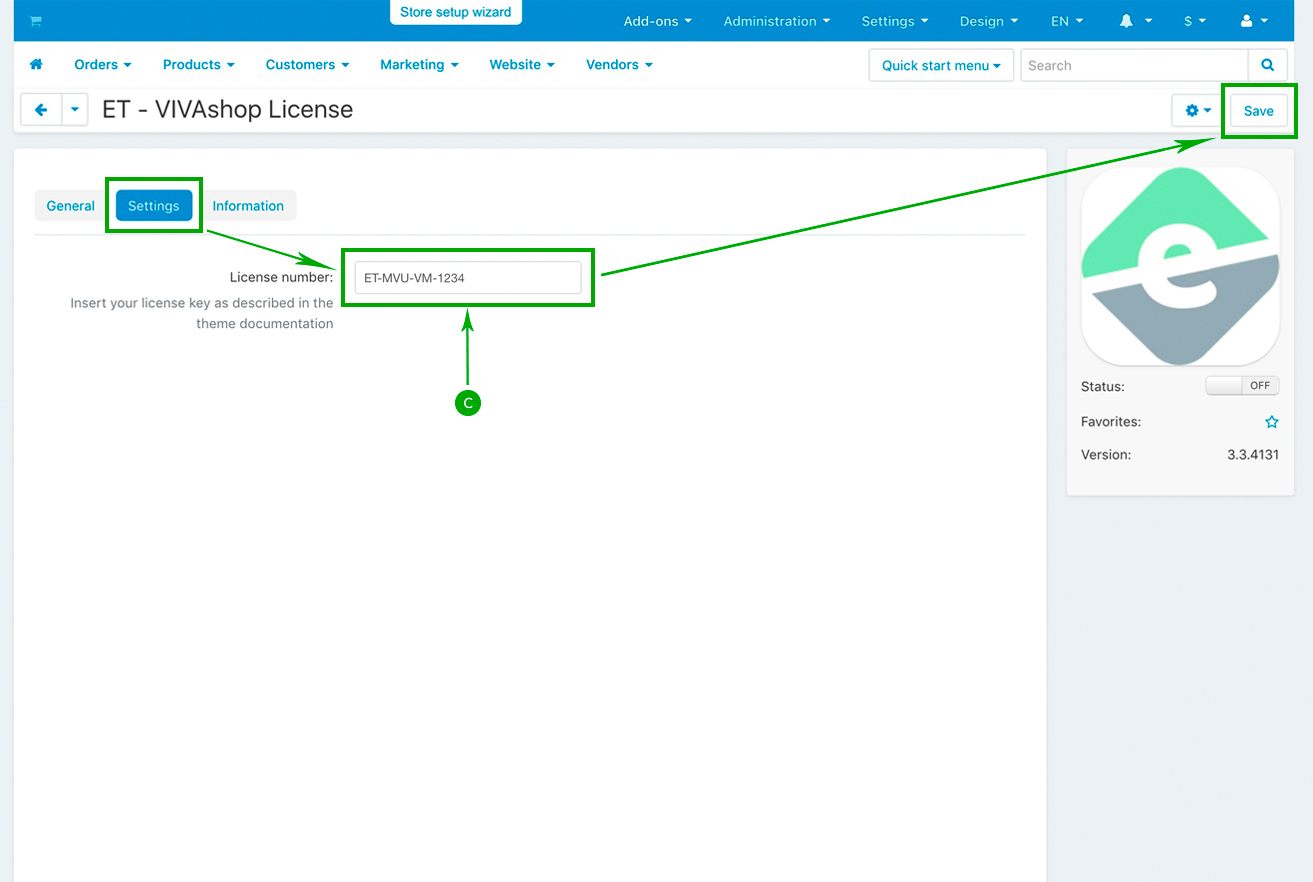 Please note that the theme will display on your site only if the “ET - VIVAshop license” addon is configured and activated. In order to activate your theme license please follow all of the steps indicated below, in the exact order they are presented: