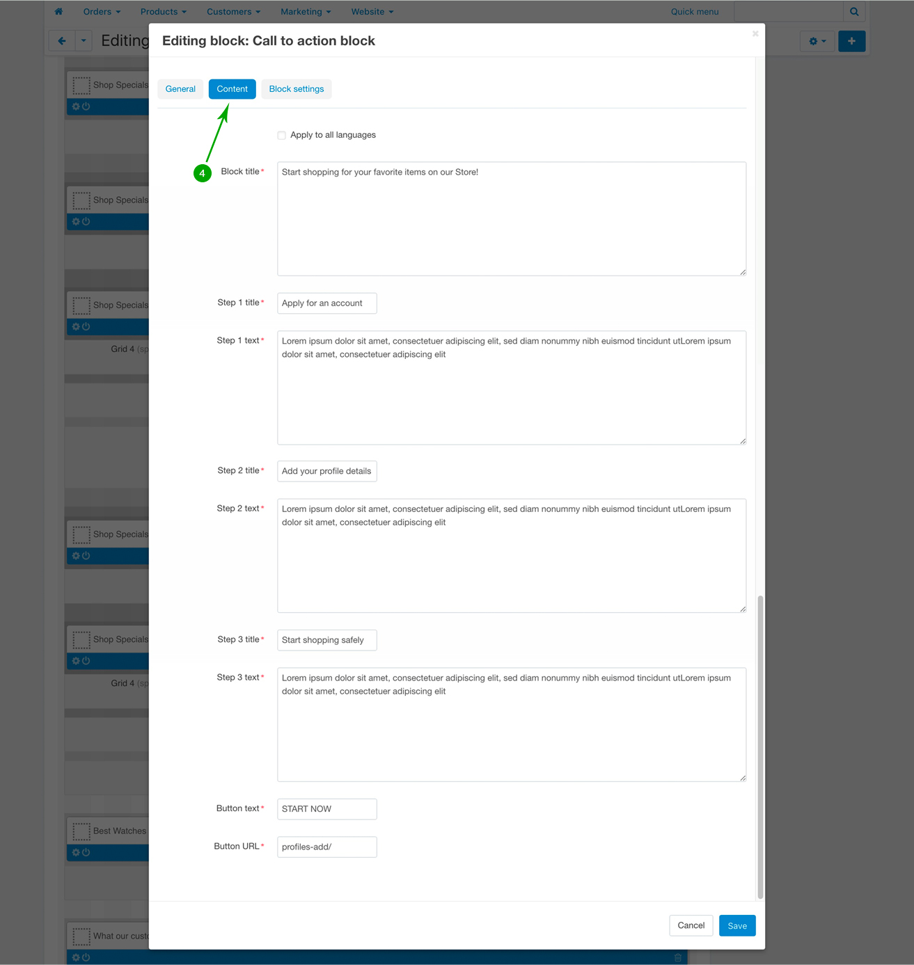 In the newly opened pop-up window, under the “Content” tab, type the text content for your block: block title, step titles and text, button text, as well as the link where you want to forward users when they click on it.