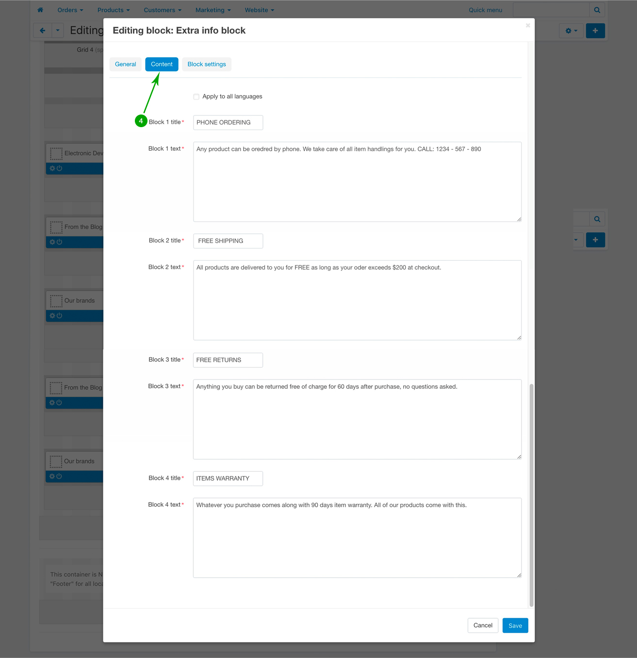 In the newly opened pop-up window, under the “Content” tab, type your desired title and the your custom text for each of the 4 points available in the “Extra info block”.