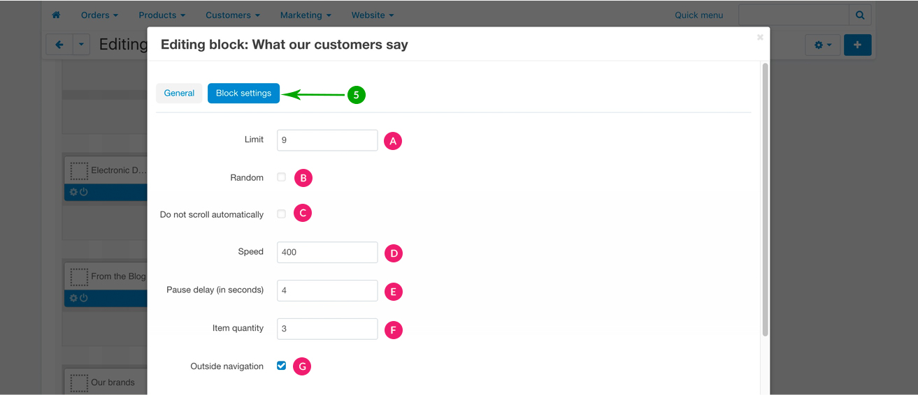 In the newly opened pop-up window, under the “General” tab, if you wish, change the block Name, as well as the other settings according to your preferences. The “Template” should however be “Scroller”, as well as the “Wrapper” should remain “ET - Multi scroller”