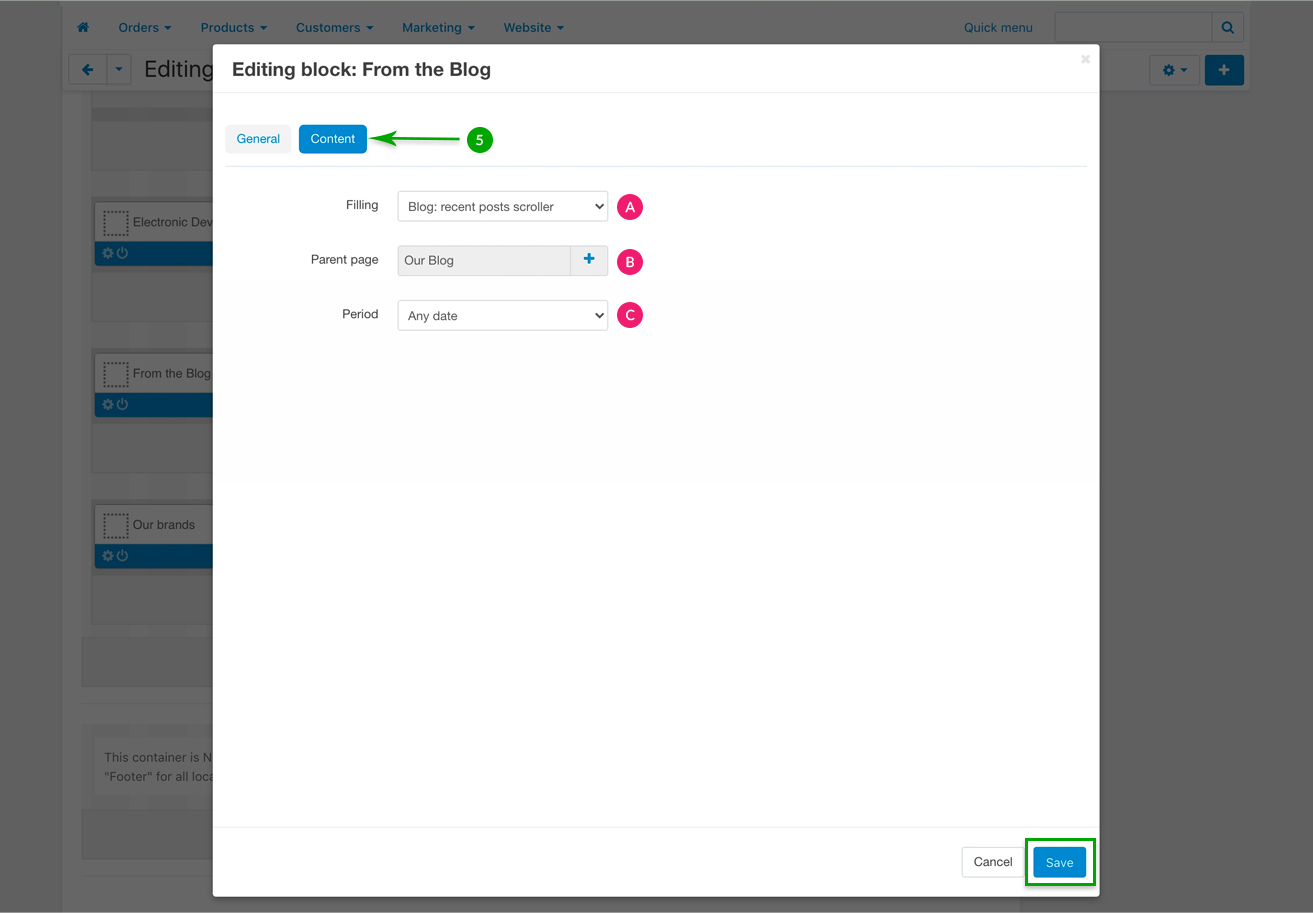 Under the “Content” tab select the content of your “From the blog” block, and then lick on the bottom right “Save” button.