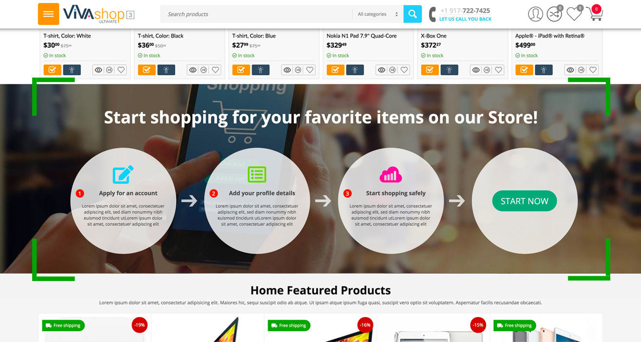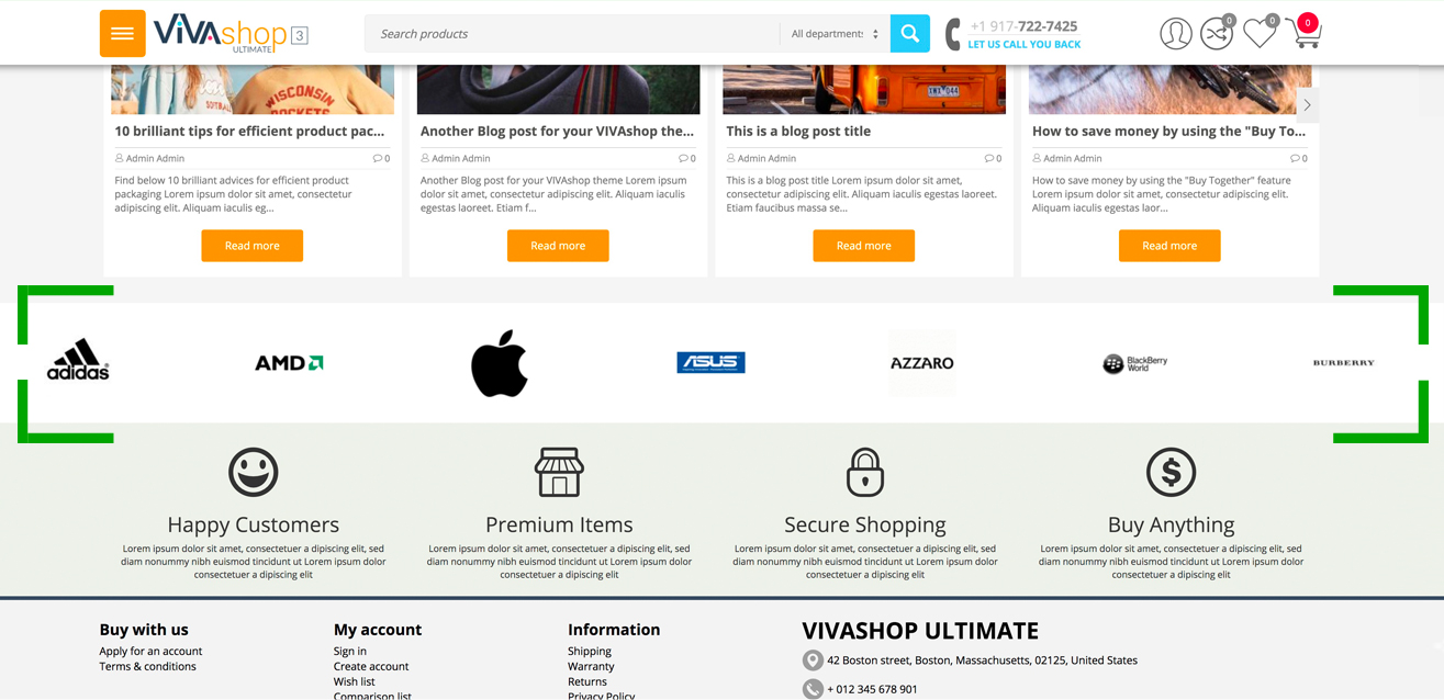 In addition to the banner blocks we mentioned about in the "Adding banners” section, VIVAshop also comes with several other blocks on the homepage, like product blocks, a call-to-action block, an extra info block, a blog posts scroller, a brands scroller as well as several blocks with featured products and banner tabs. Below we’ll go through all of them so you may learn how to add content to these blocks, as well as customize them.