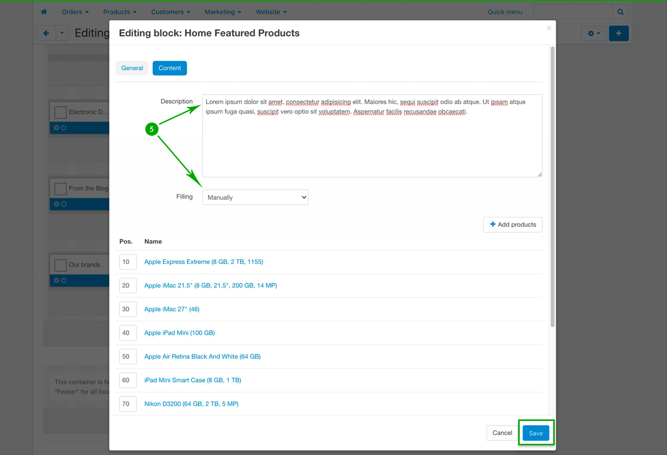 Next, under the “Content” tab, add your own block description, and then choose your filling from the “Filling” dropdown. In this particular example we have manually added products that we wanted to feature on the homepage, so we have chosen the “Manually” filling. When you’re done, click on the bottom right “Save” button.