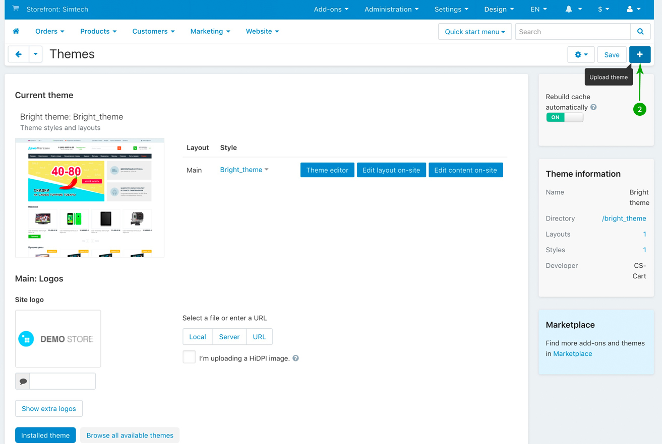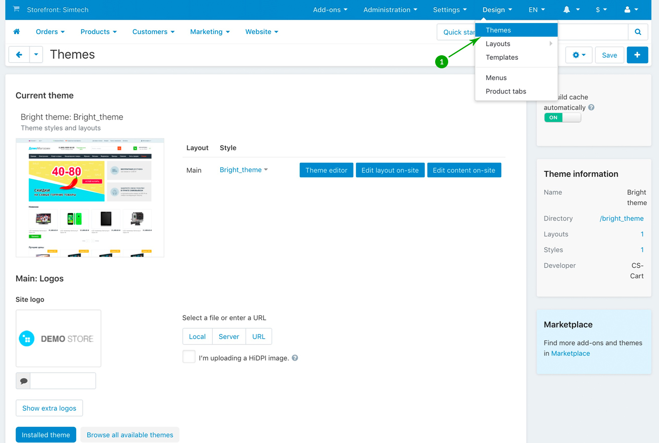 Log into your Administrator area of your CS-Cart installation and navigate to "Design" - "Themes"