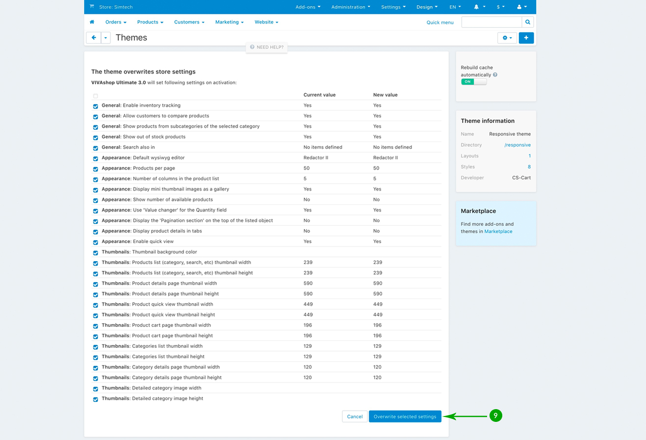 The theme settings overwrite page will notify you about the changes that will be made. Click on the blue "Overwrite selected settings button" at the bottom.