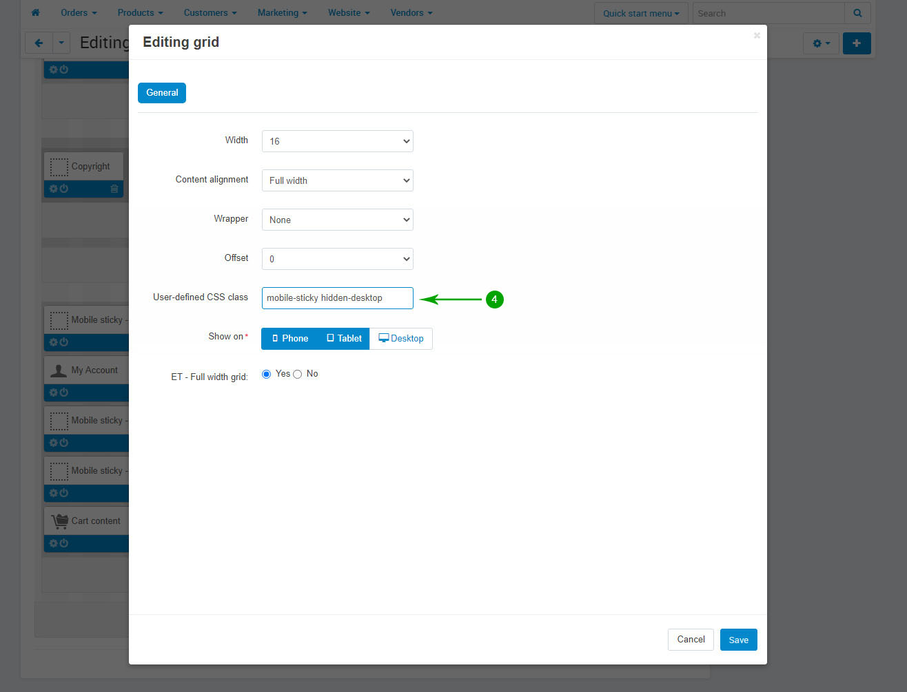 Scroll to the bottom and find the "Grid 16 (span 16)" grid that contains the contains the following blocks: "Mobile sticky - Home", "My Account", "Mobile sticky - Compare", "Mobile sticky - Wishlist", "Cart content". Click the gear icon (Grid options).