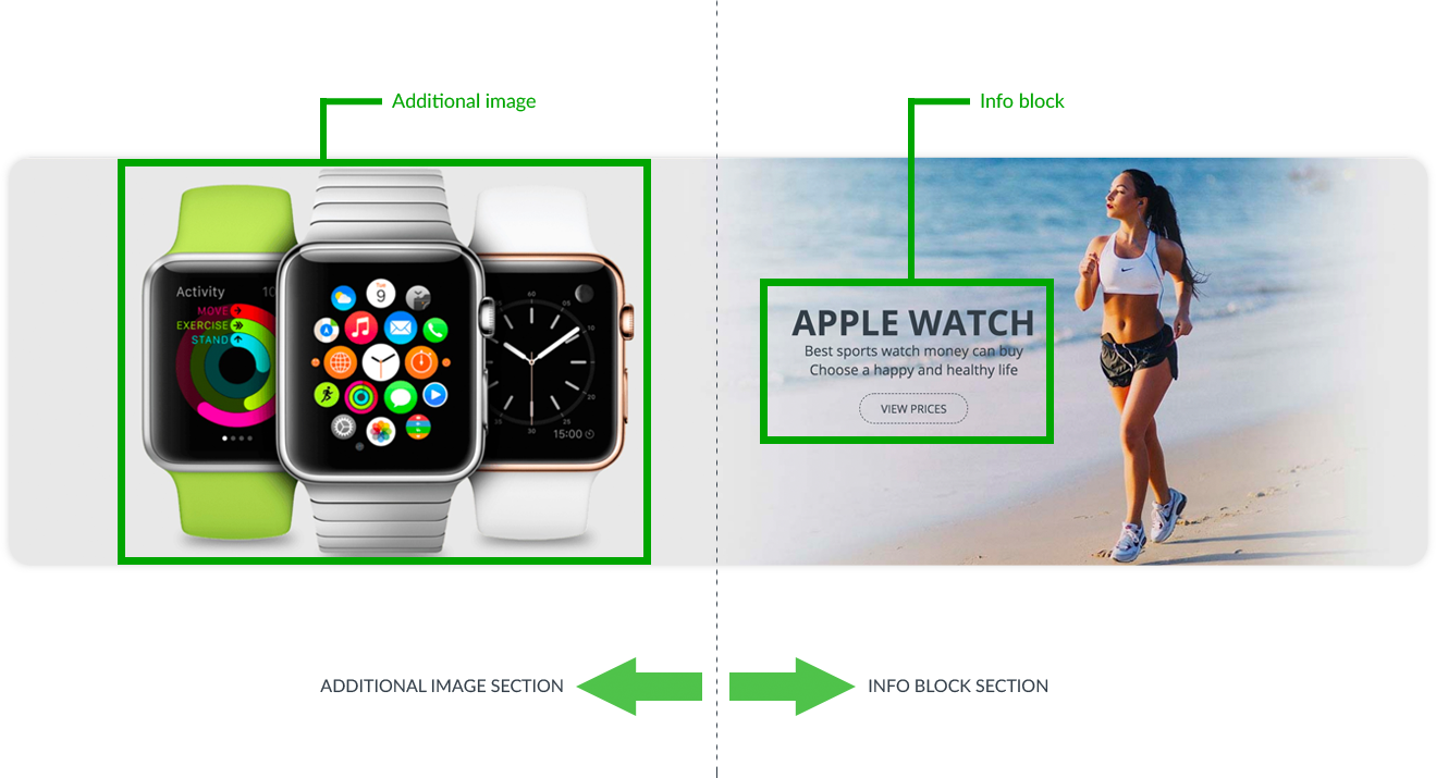 The width of each section is determined by the Additional Image width (if it is positioned horizontally with the Info Block). In other words, the width of the section where Additional Image is located is equal to the image width, and the rest of banner width will belong to the Info Block section. Also, (if it is positioned vertically with the Info Block, the height of each section is determined by the Additional Image height. In other words, the height of the section where the Additional Image is located is equal to the image height, and the rest of banner height will belong to the Info Block section.