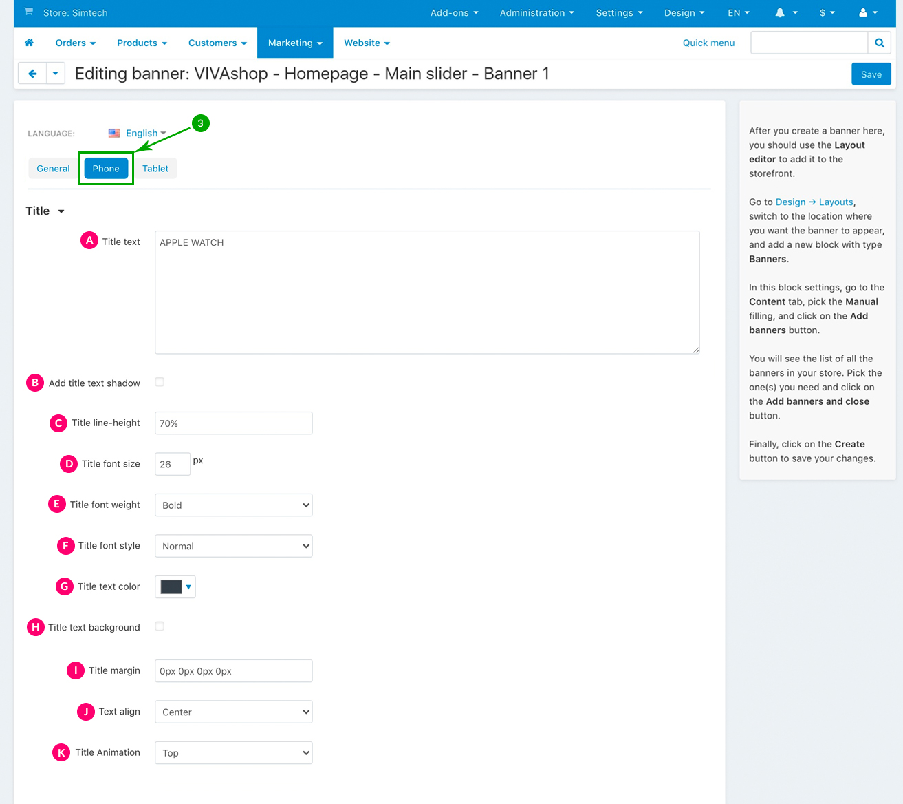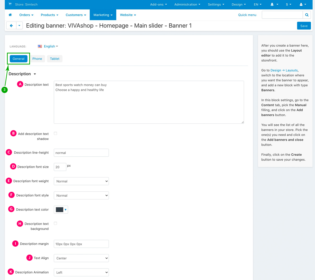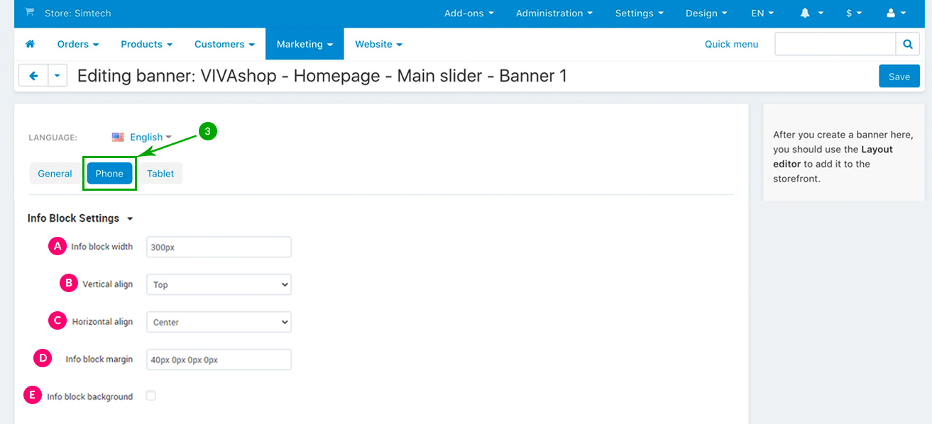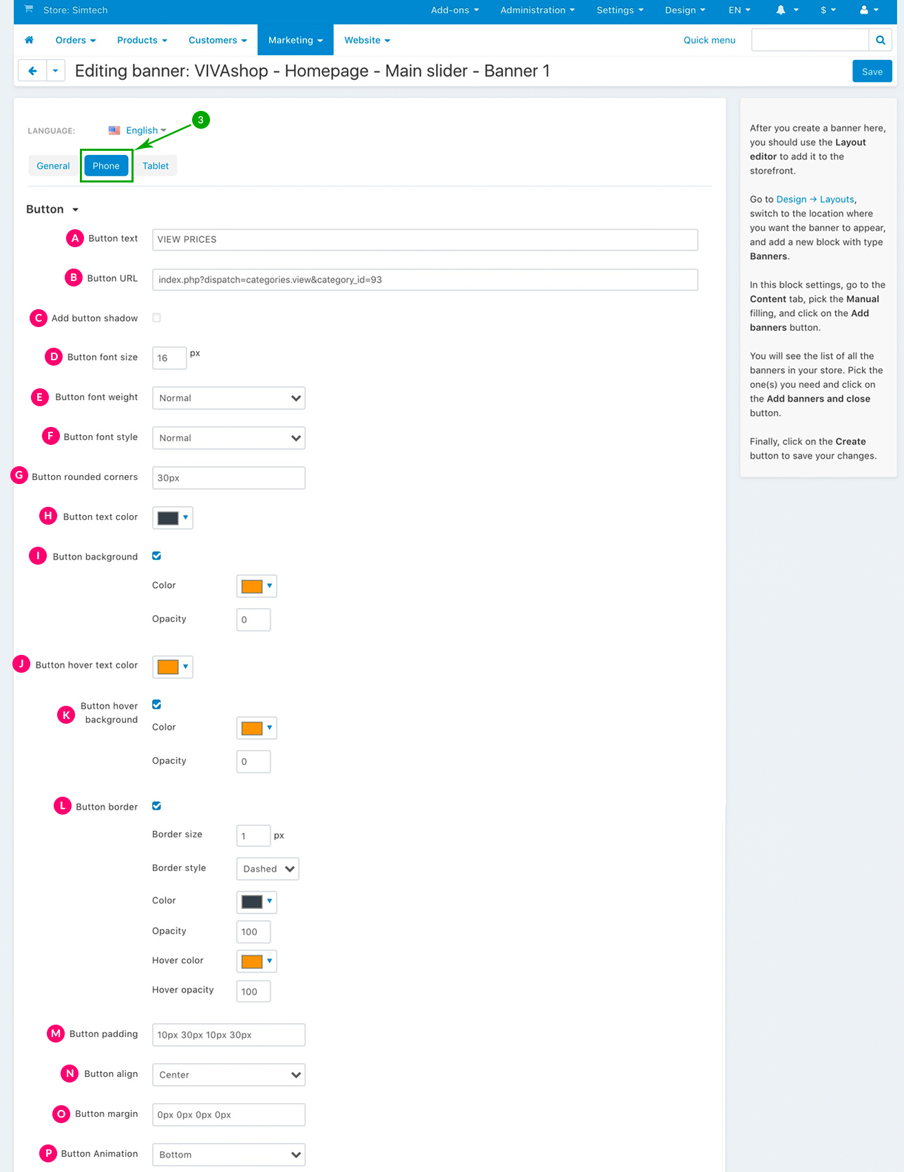 For the “VIVAshop - Homepage - Main slider - Banner 1” banner we have used the following options for sections C, D and E: