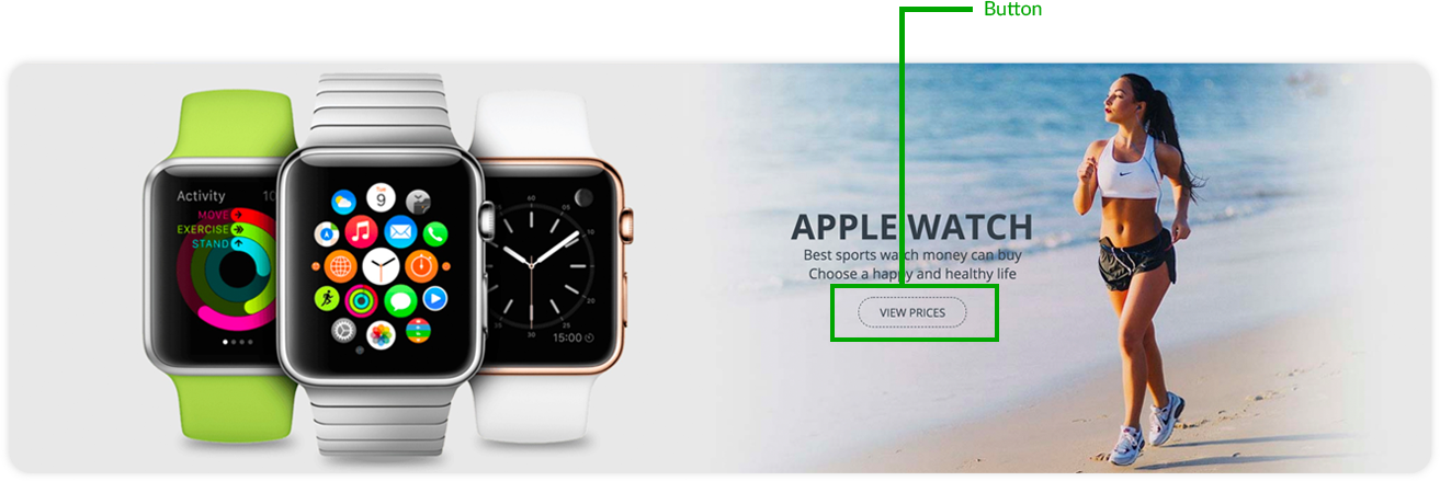 - Center - Place the button in the center, inside the Info Block (this is the option that we have selected for the demo “VIVAshop - Homepage - Main slider - Banner 1” banner)