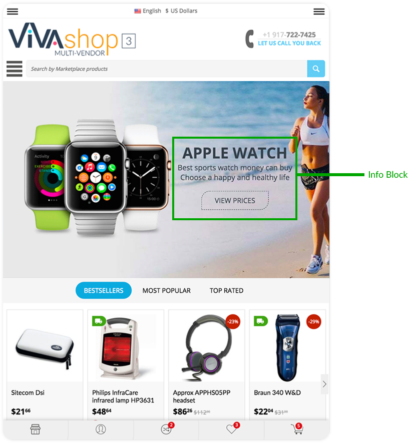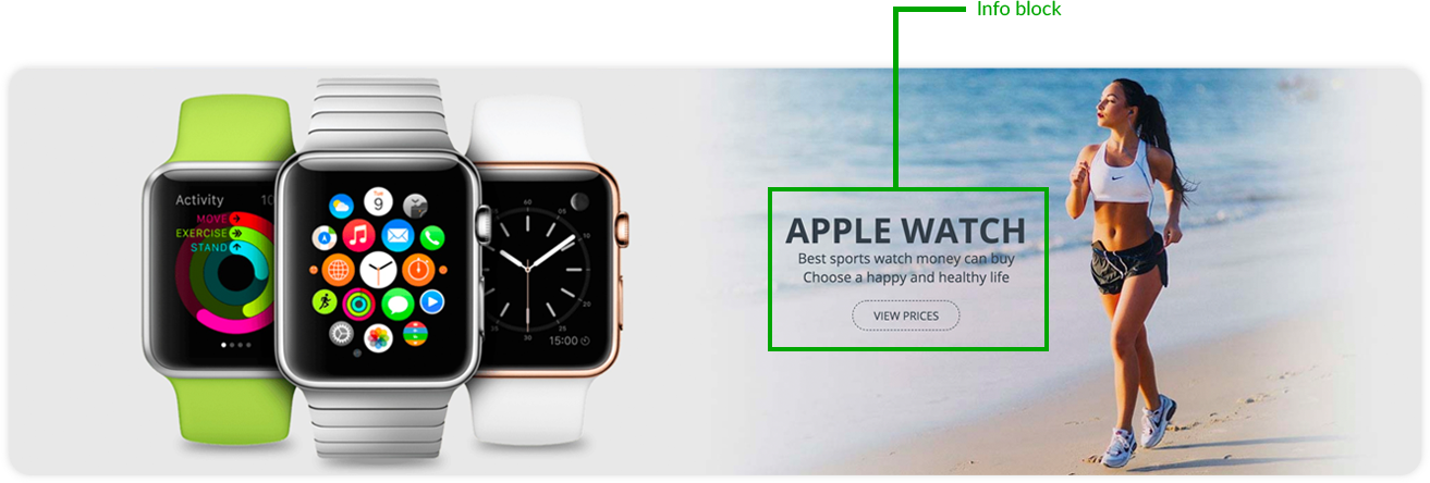 - Center - Place the description text in the center, inside the Info Block (this is the option that we have selected for the demo “VIVAshop - Homepage - Main slider - Banner 1” banner)