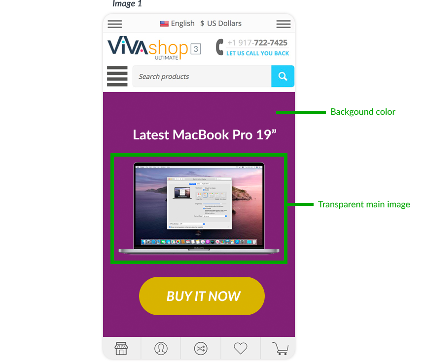 For the “VIVAshop - Homepage - Main slider - Banner 1” banner we have chosen the “Bottom” option, so the Additional Image will come from the bottom.