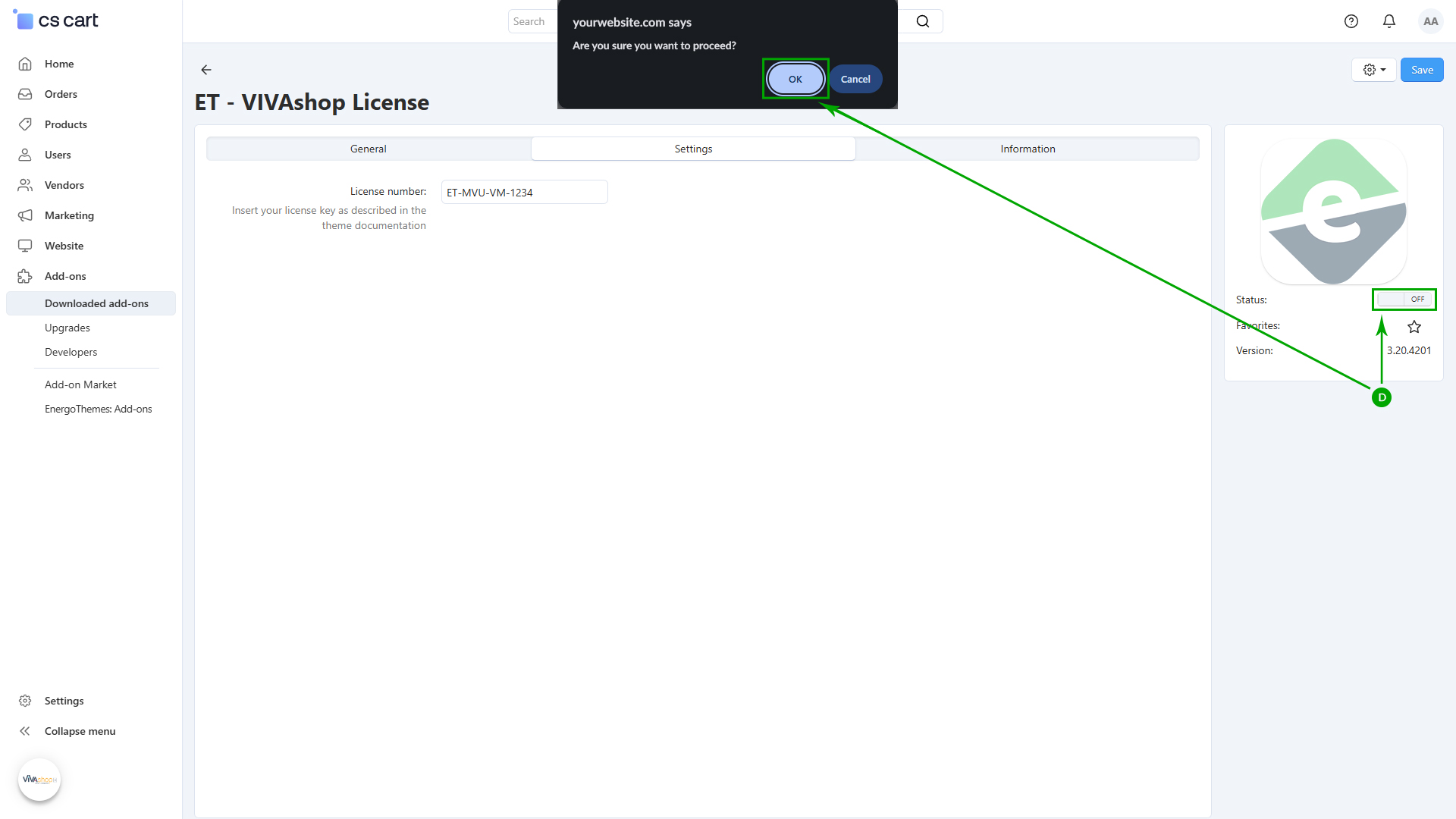 D: Switch the add-on Status to "ON". A pop-up will appear asking to confirm the action. Click on the "OK" button.