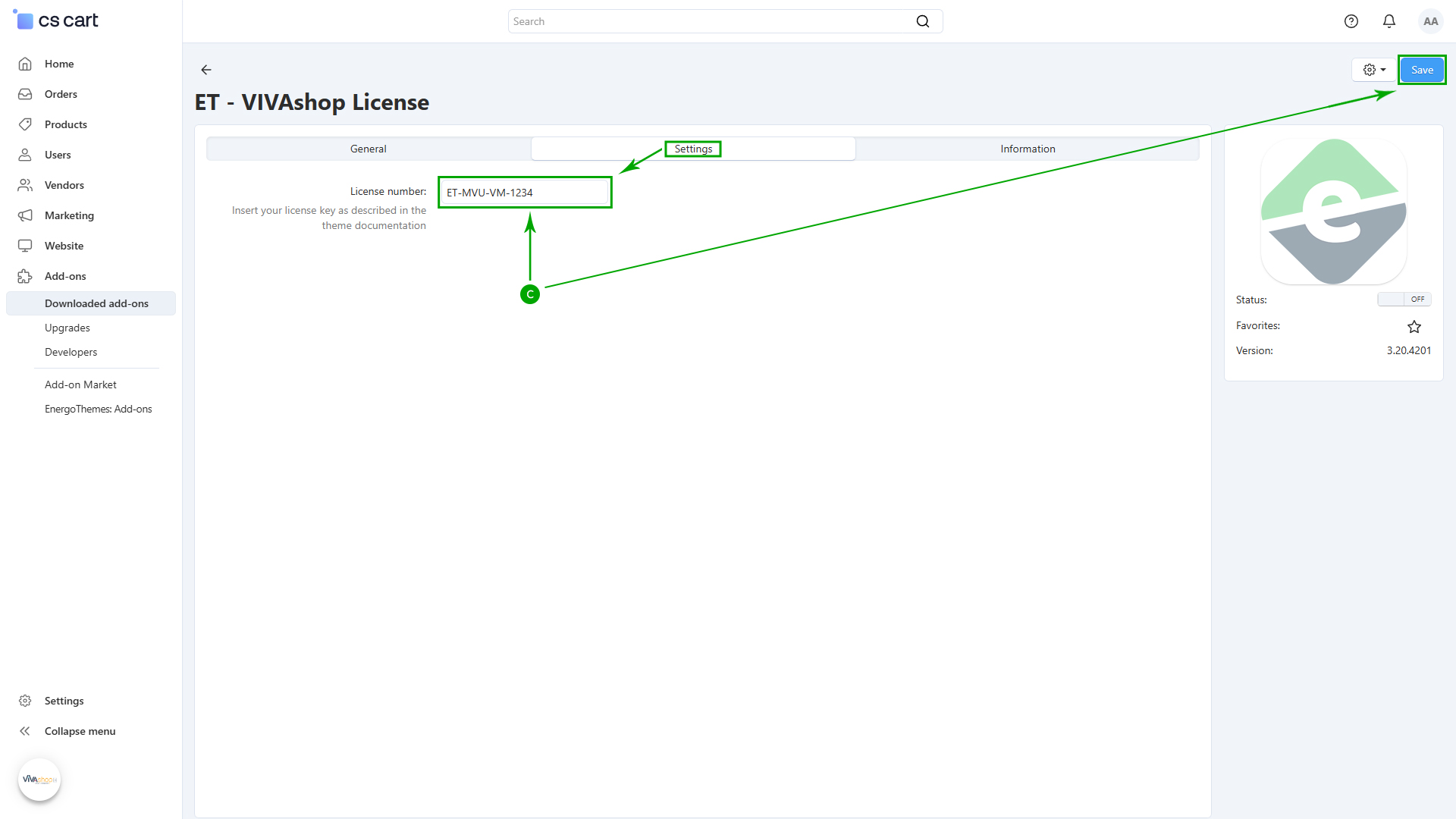 Now you need to insert the license number and activate the “ET - VIVAshop license” add-on. To do so, please follow the steps below: