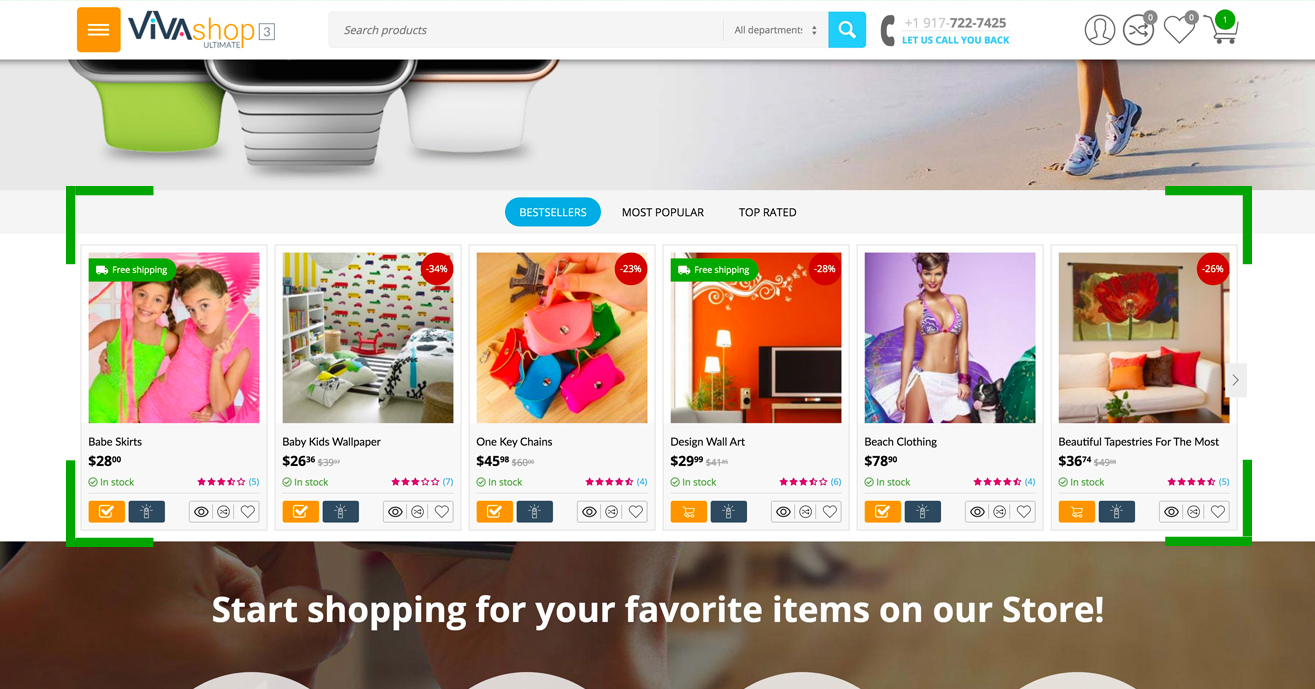 Right below the homepage main slider banners, we have included 3 tabs with products scollers: "Bestsellers”, "Most Popular” and "Top Rated”. Of course you can change the name of any of them, as well as choose any products of your choice to display under each tab. Below are the steps that you need to take in order to add content to the "Bestsellers” block, for the other two blocks ("Most Popular” and "Top Rated”) all you have to do is to simply repeat the process: