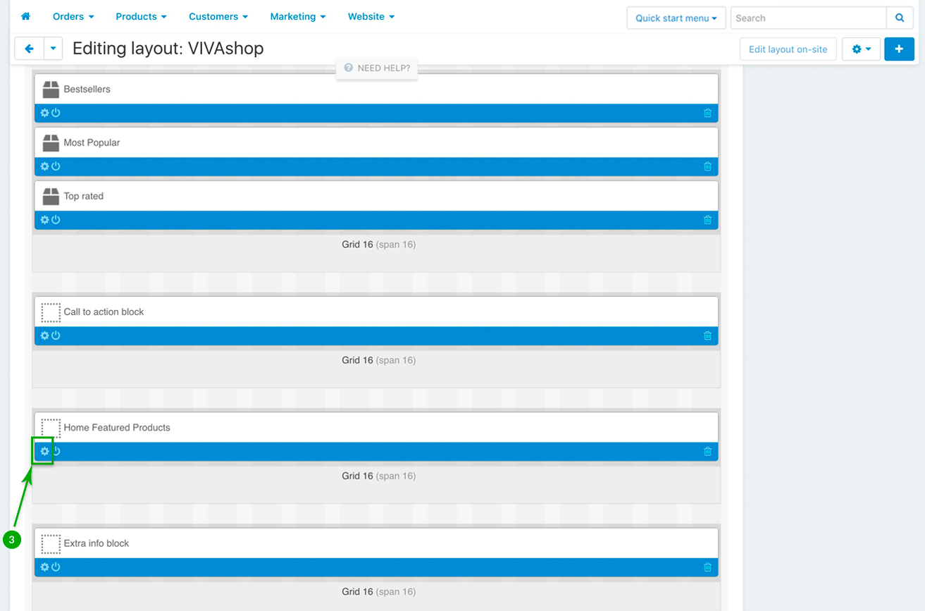 Scroll down and look for the “Home Featured Products” block, and click on the “Block options” of this block