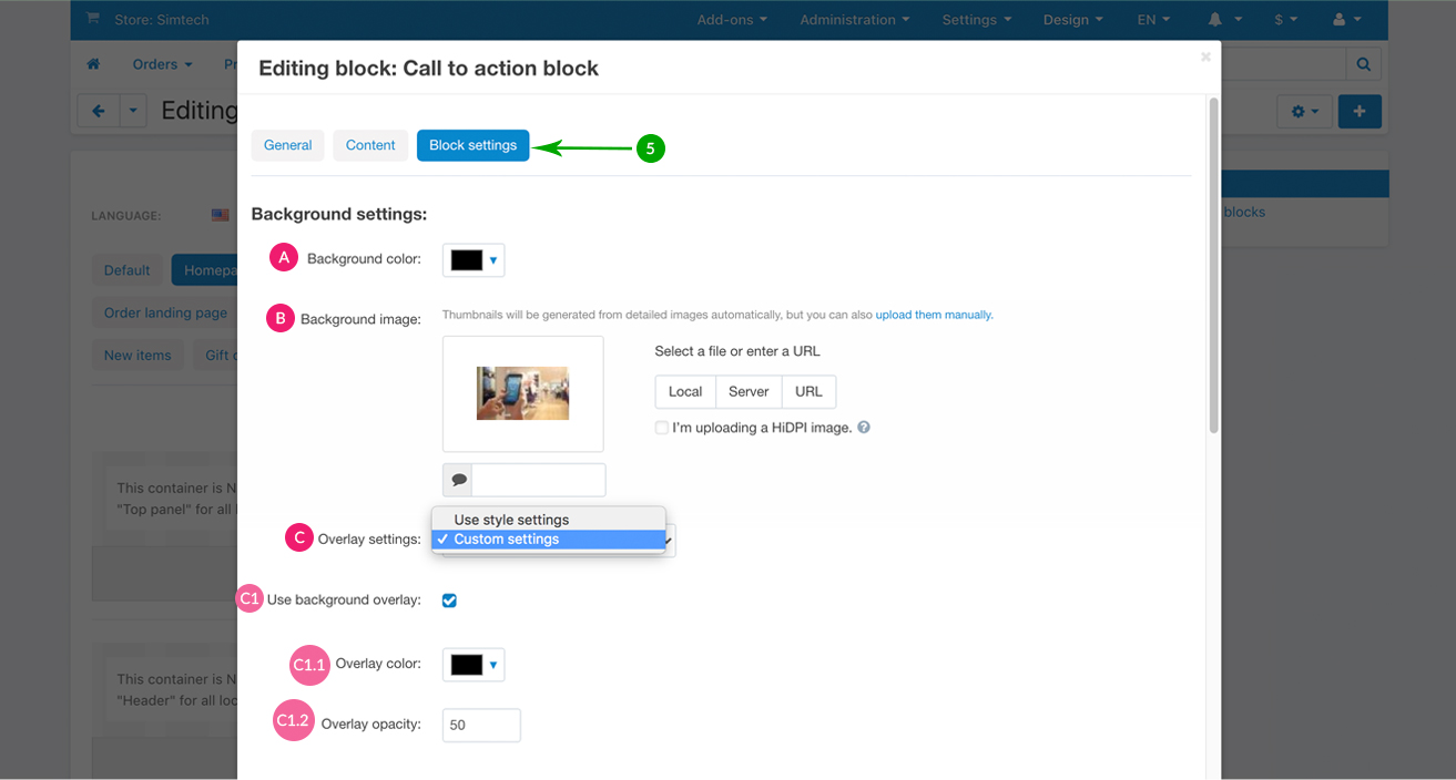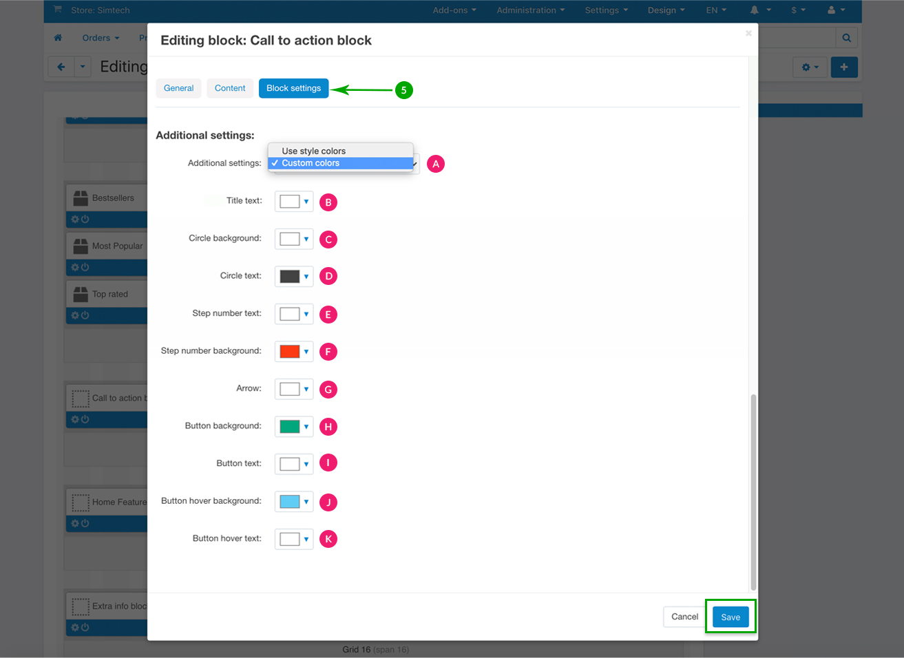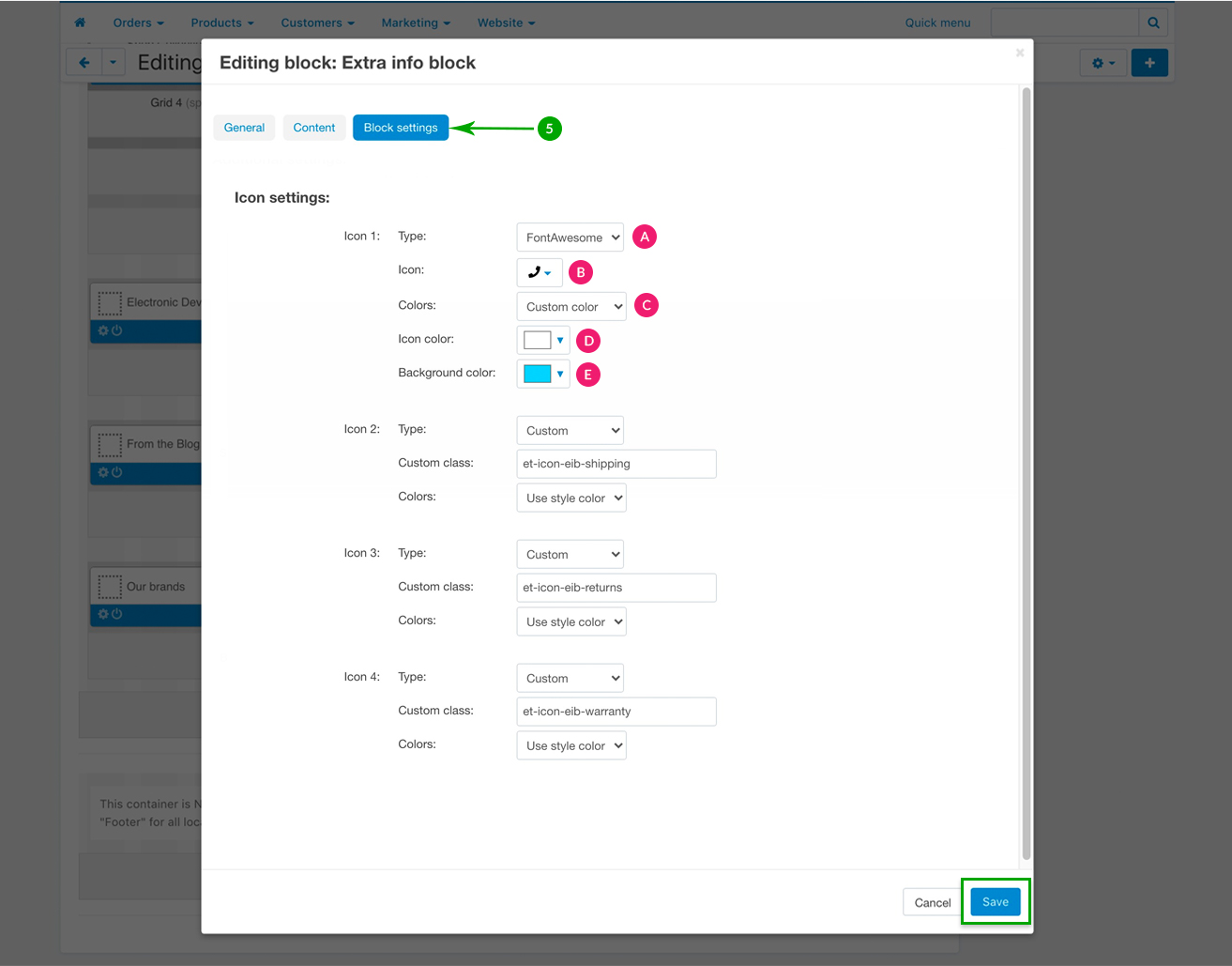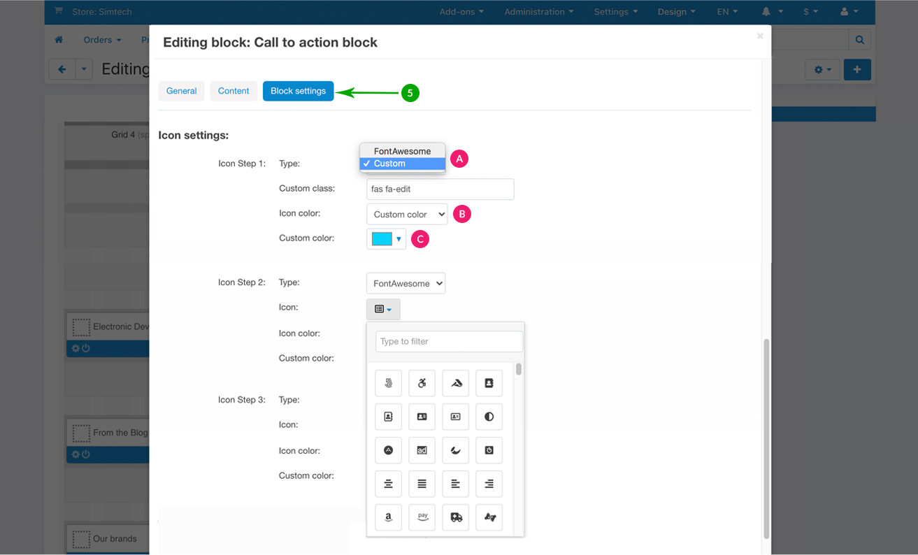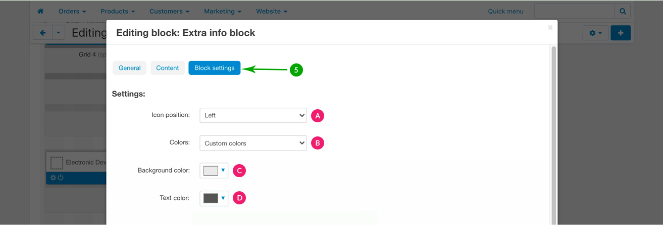 Next, under the “Block settings” tab you can choose your settings for the block background, icons and text.