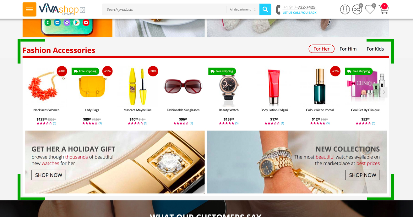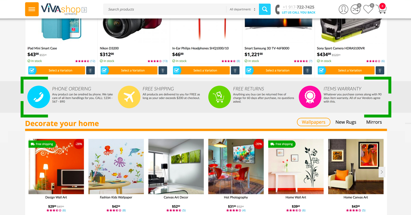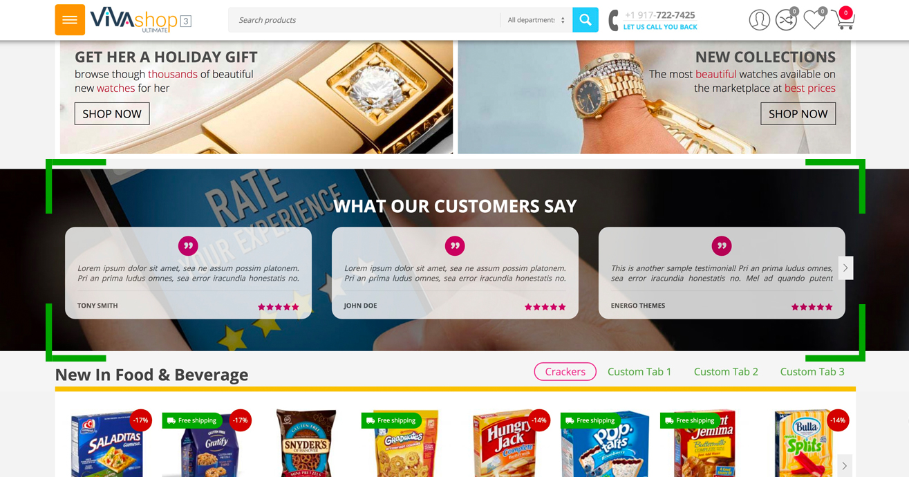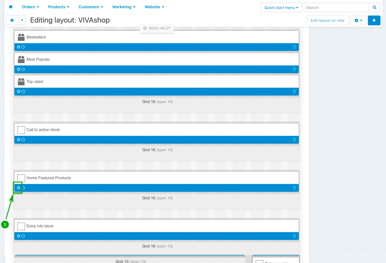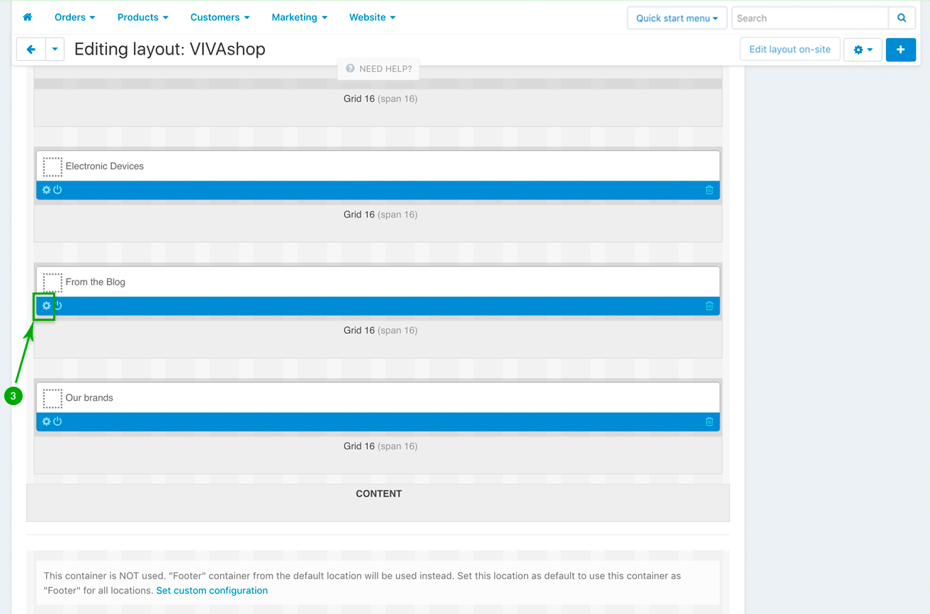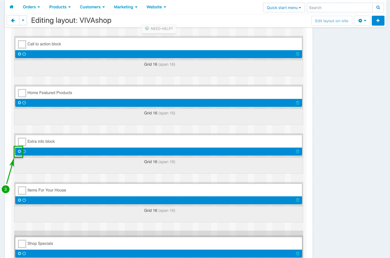 In addition to the banner blocks we mentioned about in the "Adding banners” section, VIVAshop also comes with several other blocks on the homepage, like product blocks, a call-to-action block, an extra info block, a blog posts scroller, a brands scroller as well as several blocks with featured products and banner tabs. Below we’ll go through all of them so you may learn how to add content to these blocks, as well as customize them.