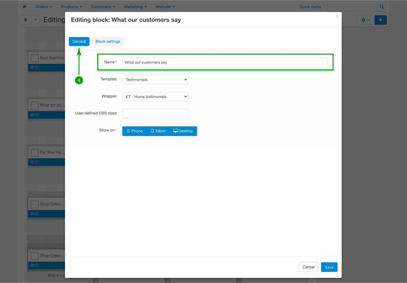 In the newly opened pop-up window, under the “General” tab, type your desired block name. This name will appear as a title for the block on your homepage. The “Template” should remain “Testimonials”, and the Wrapper should also remain “ET - Home testimonials”.