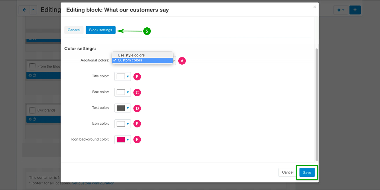 Next, under the “Block settings” tab you can choose your settings for the testimonials block, as well as the background and color settings. Click the bottom right “Save” button when you’re done.