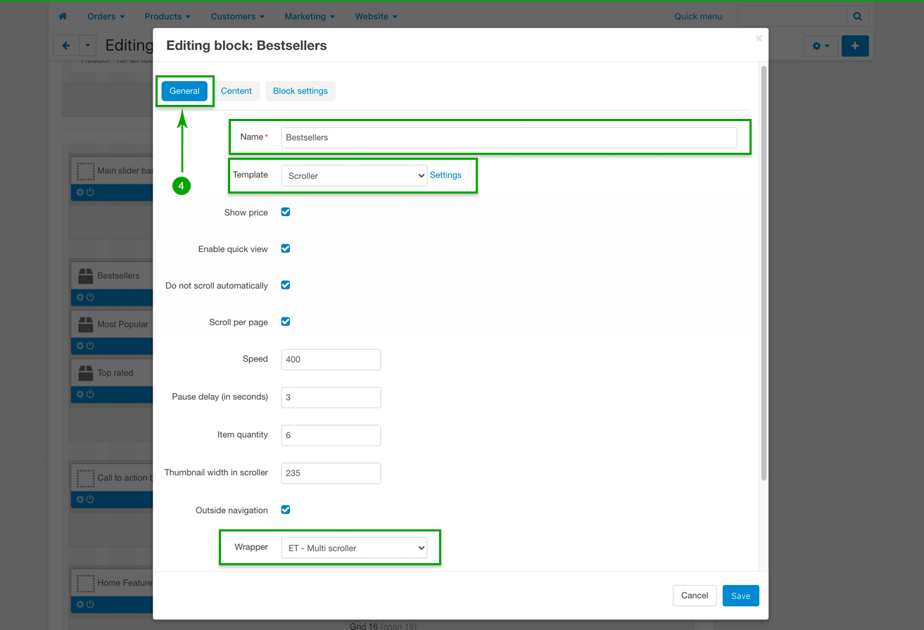 In the newly opened pop-up window, under the “General” tab, if you wish, change the block Name, as well as the other settings according to your preferences. The “Template” should however be “Scroller”, as well as the “Wrapper” should remain “ET - Multi scroller”