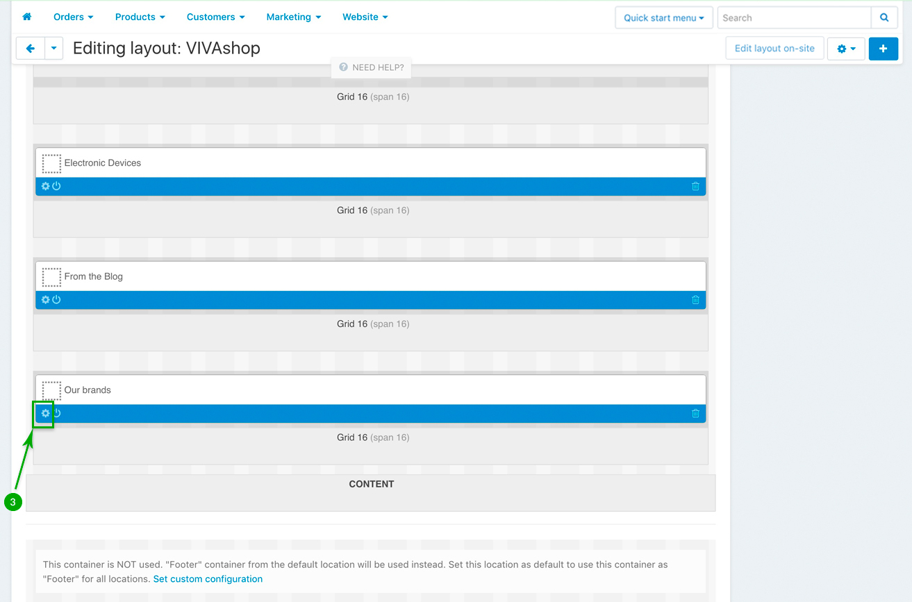 Scroll down and look for the “Our brands” block, and click on the “Block options” of this block