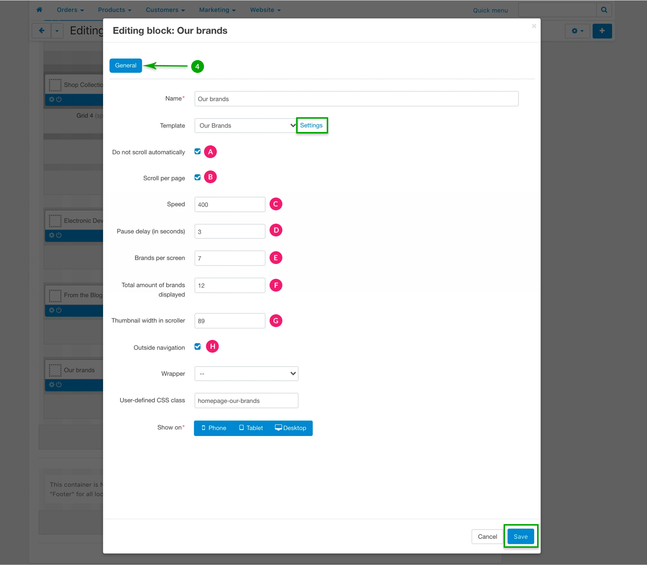 Under the “General” tab, give your block a custom name if you want, the “User-defined CSS class” should remain “homepage-our-brands”. If you click on the “Settings” link right next to the “Template” field, the blog scroller options will be displayed so you may configure it. Choose your configuration options, then click on the bottom right “Save” button.
