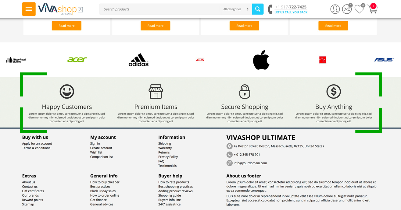 Simply add some other important and catchy information specific to your store using the “Footer info block”. This block is not only displayed on your homepage, but on every single page of your shop. The way you configure this block is just the same as the “Extra info block” which we explained above, so please follow the same steps we described for “Extra info block”.