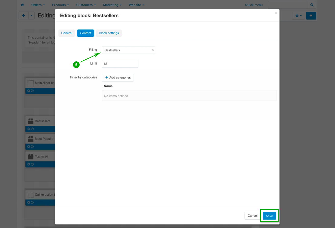 Next, because this example is about how to add bestseller products, under the “Content” tab, choose “Bestsellers” from the “Filling” dropdown. However, you can choose any other filling, reflecting the products you want to add under these tabs. When you’re done, simply click on the bottom right “Save” button.