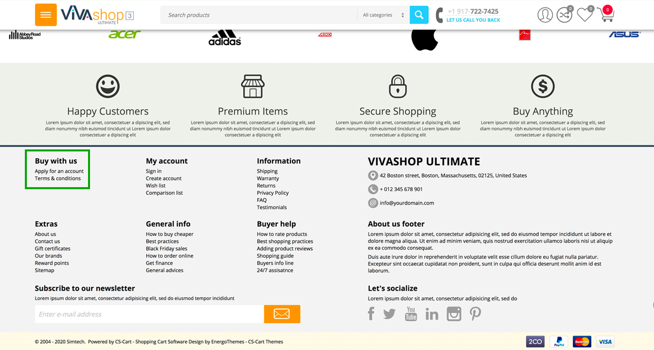 In the footer of VIVAshop there are several blocks with links, information, social buttons, as well as the newsletter. All of these blocks are automatically added when the theme is installed. The “My account” link simply uses the “My account” link template, which will automatically add the links related to the user account. Also, the “Subscribe to our newsletter” block uses the “Newsletter: subscription form” template from the default CS-Cart Newsletter addon. The other blocks already have pre-defined code inside, so all you need to do is to change the text and links accordingly.