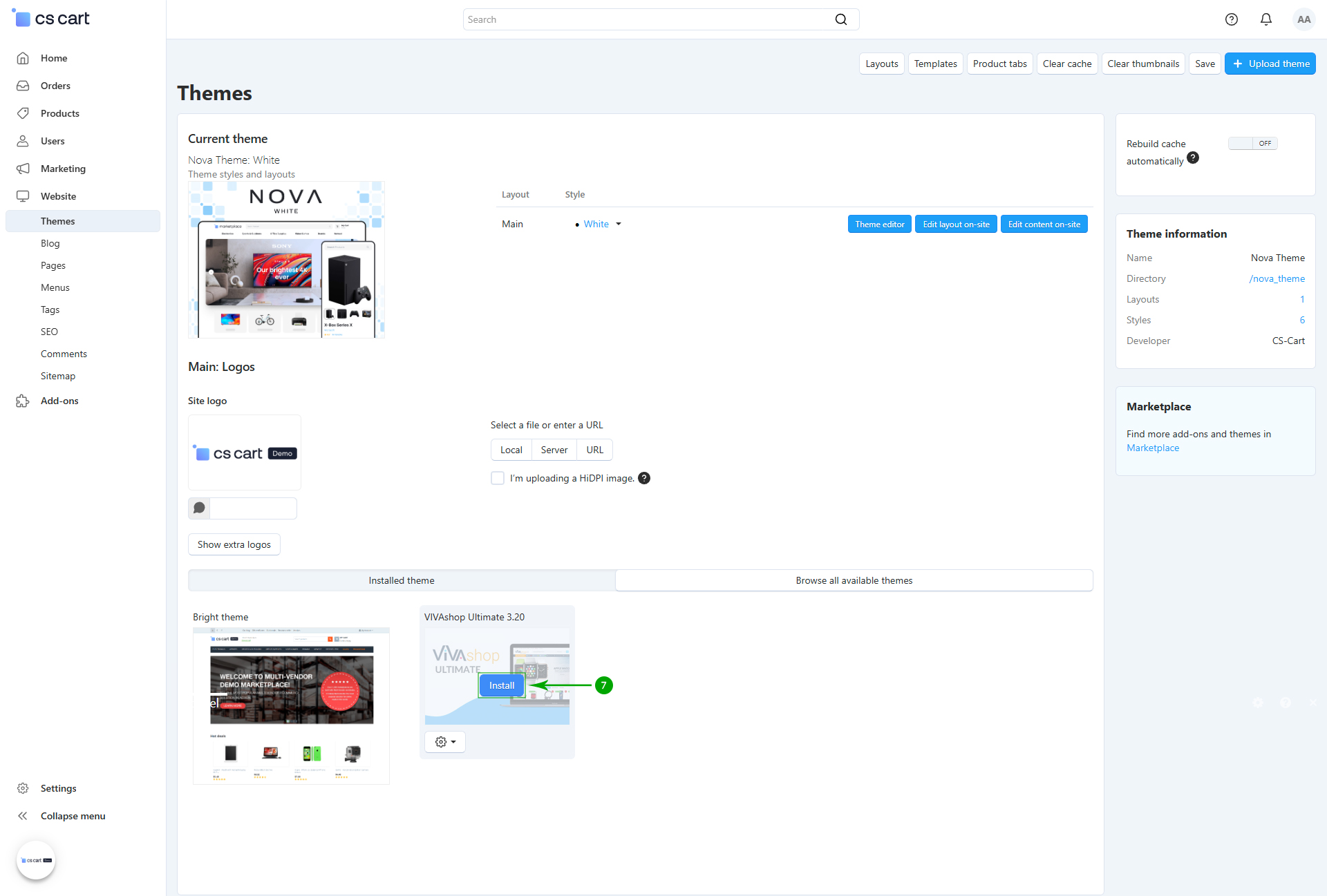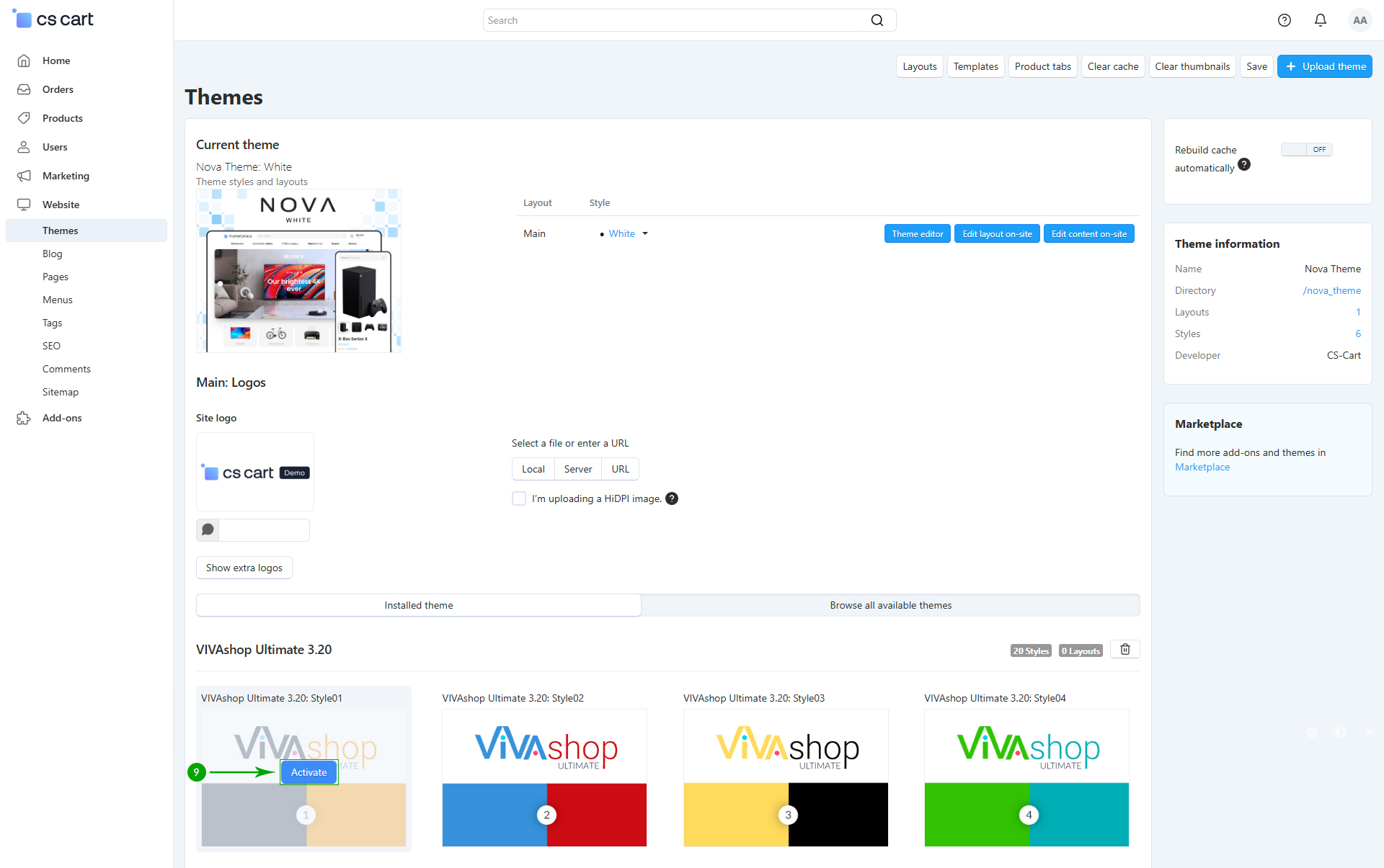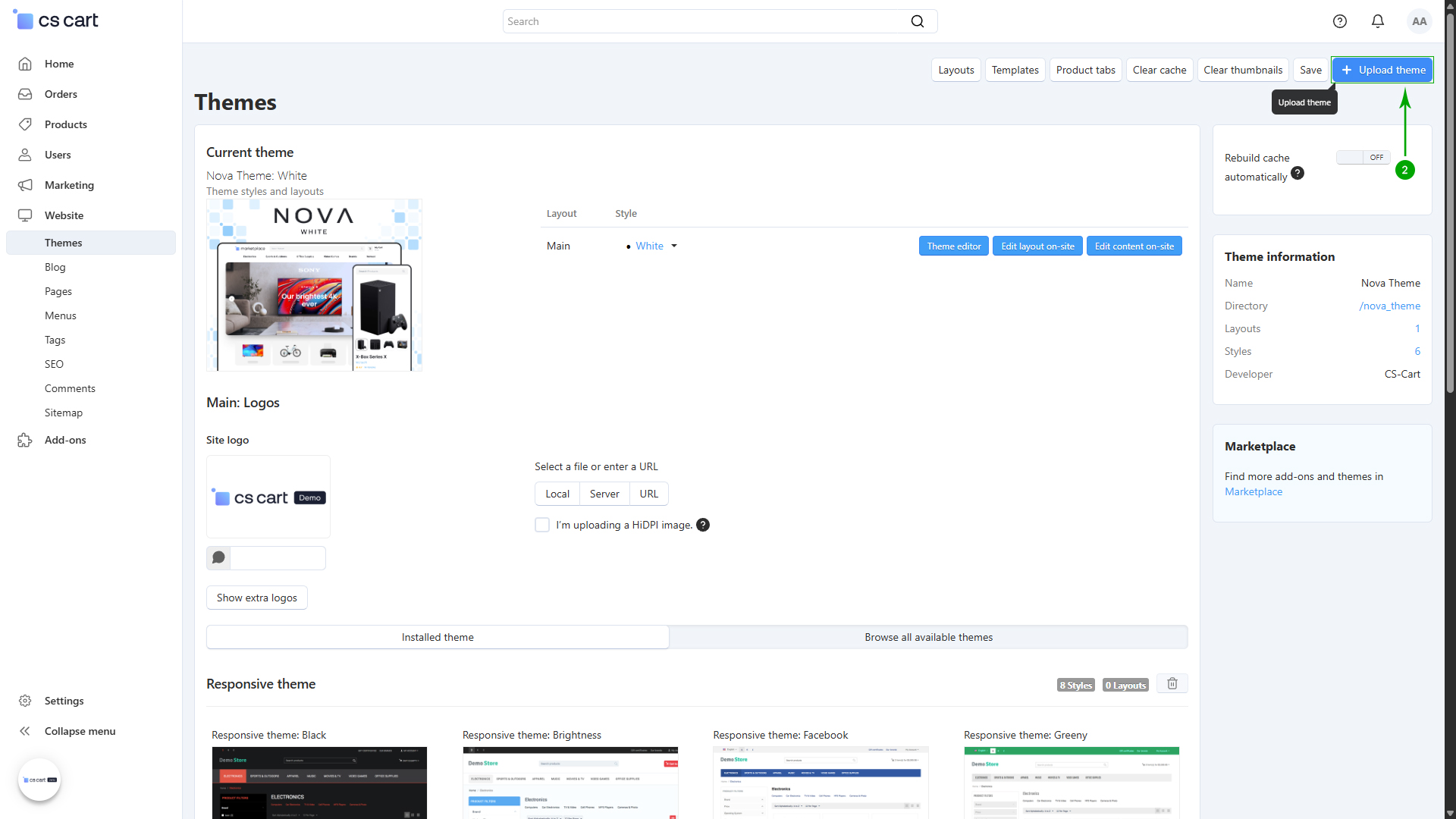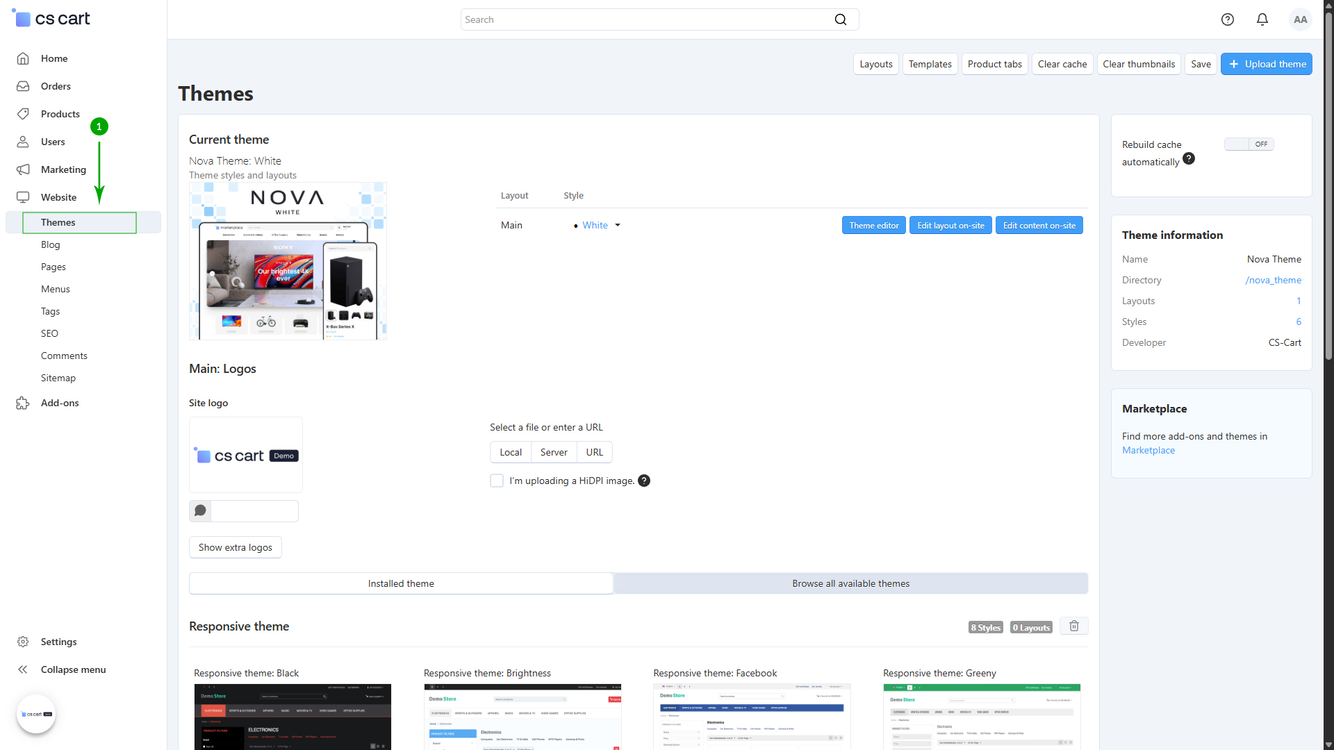 Log into your Administrator area of your CS-Cart installation and navigate to "Design" - "Themes"