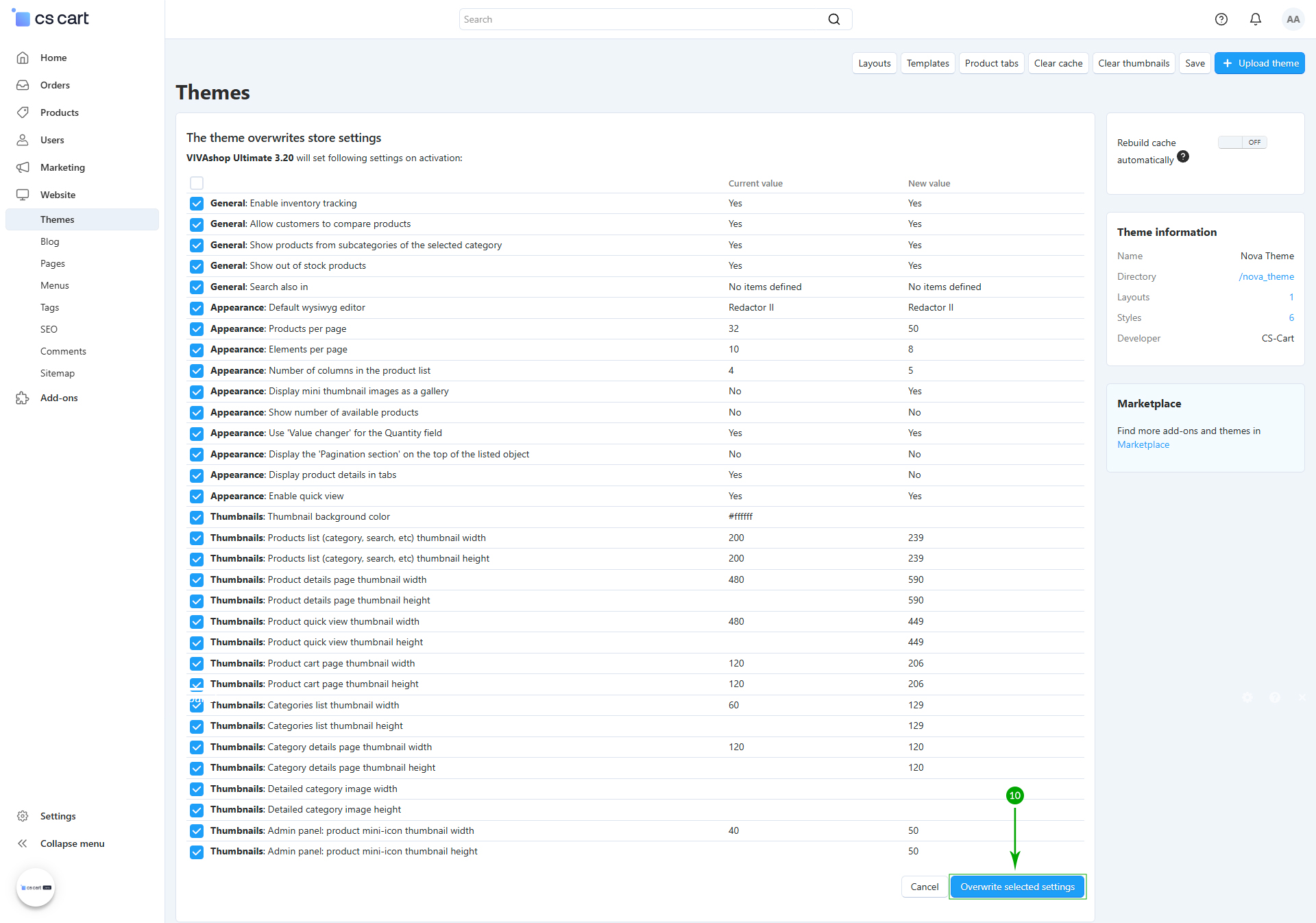 The theme settings overwrite page will notify you about the changes that will be made. Click on the blue "Overwrite selected settings button" at the bottom.