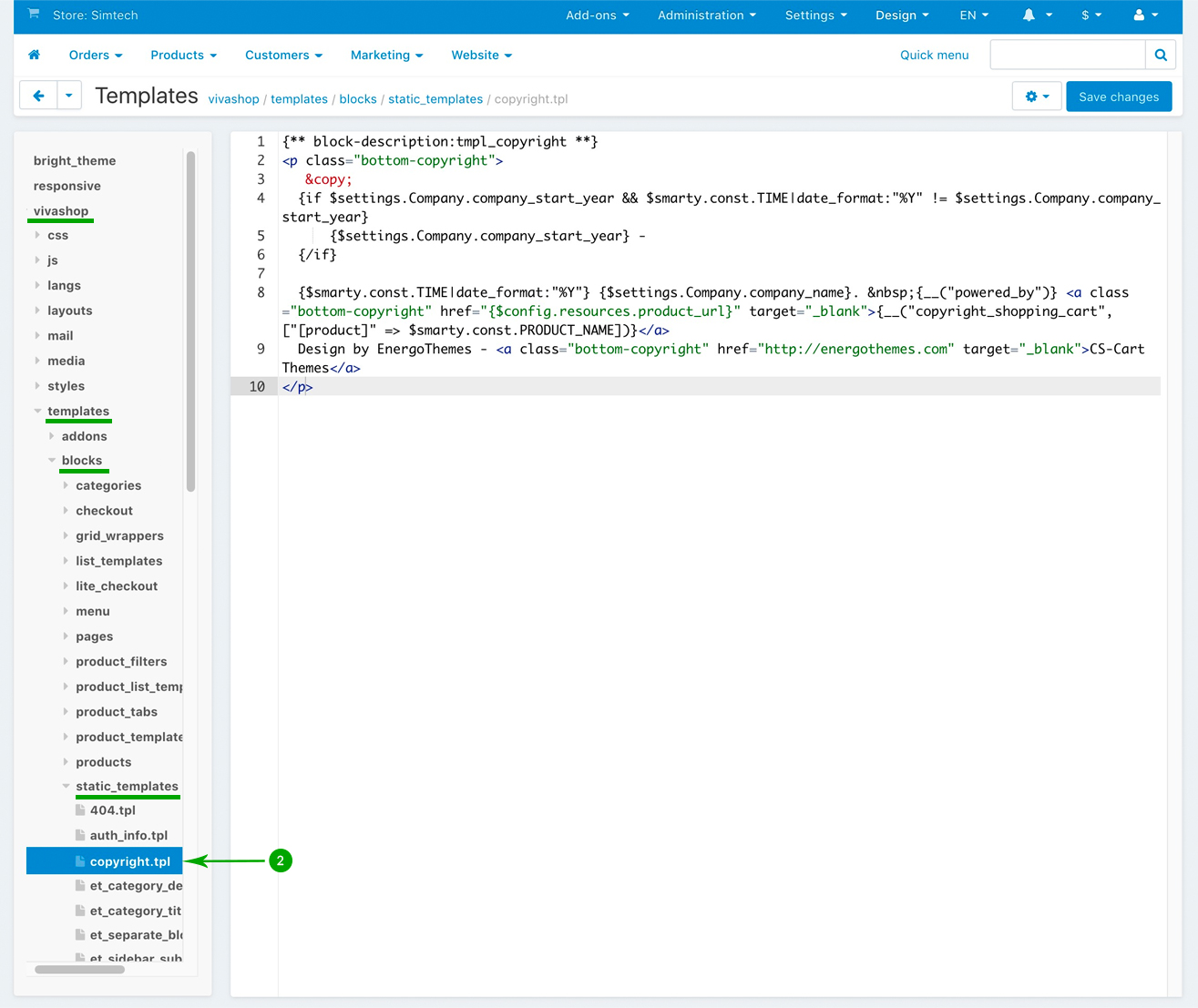 On the left side navigate to the "vivashop/templates/blocks/static_templates" folder and click the file "copyright.tpl"