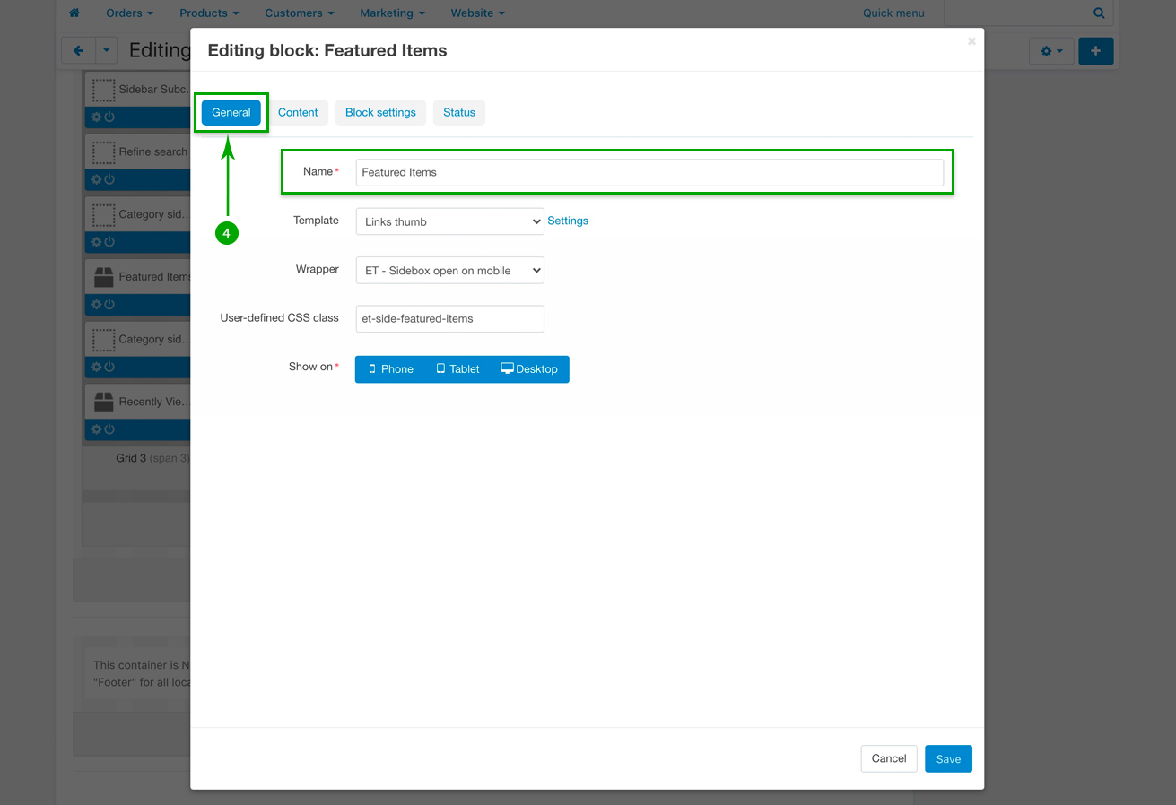 In the newly opened pop-up window, under the “General” tab, if you wish, change the block Name, as well as the other settings according to your preferences. The “Template” should however be “Links thumb”, the “Wrapper” should be “ET - Sidebox open on mobile”, and the “User-defined CSS class” should remain “et-side-featured-items”
