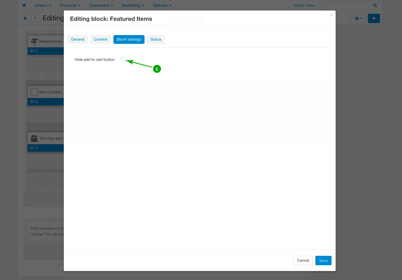 On the “Block settings” tab, the “Hide add to cart” option is not available, as the products are displayed in small sizes, so there is no add to cart button anyway.