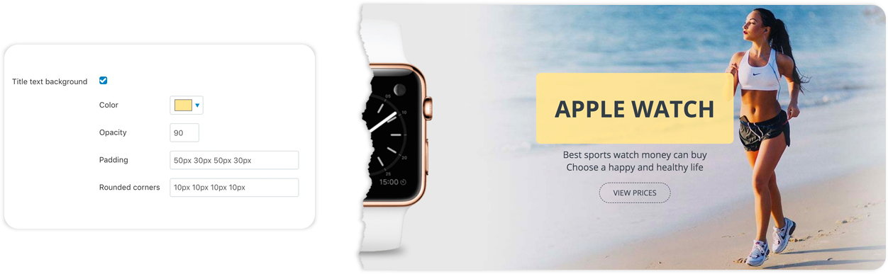 - Rounded corners - Set the corners for your title text background. The setting format is same as margins and paddings, meaning “TLpx TRpx BRpx BLpx”, where “TL” is the value for the top left corner, “TR” is the value for the top right corner , “BR” is the value for the bottom right corner, and “BL” is the value for the bottom left corner. These values are in pixels. In the above example we have used “10px 10px 10px 10px”, meaning that all background corners have a 10px radius.